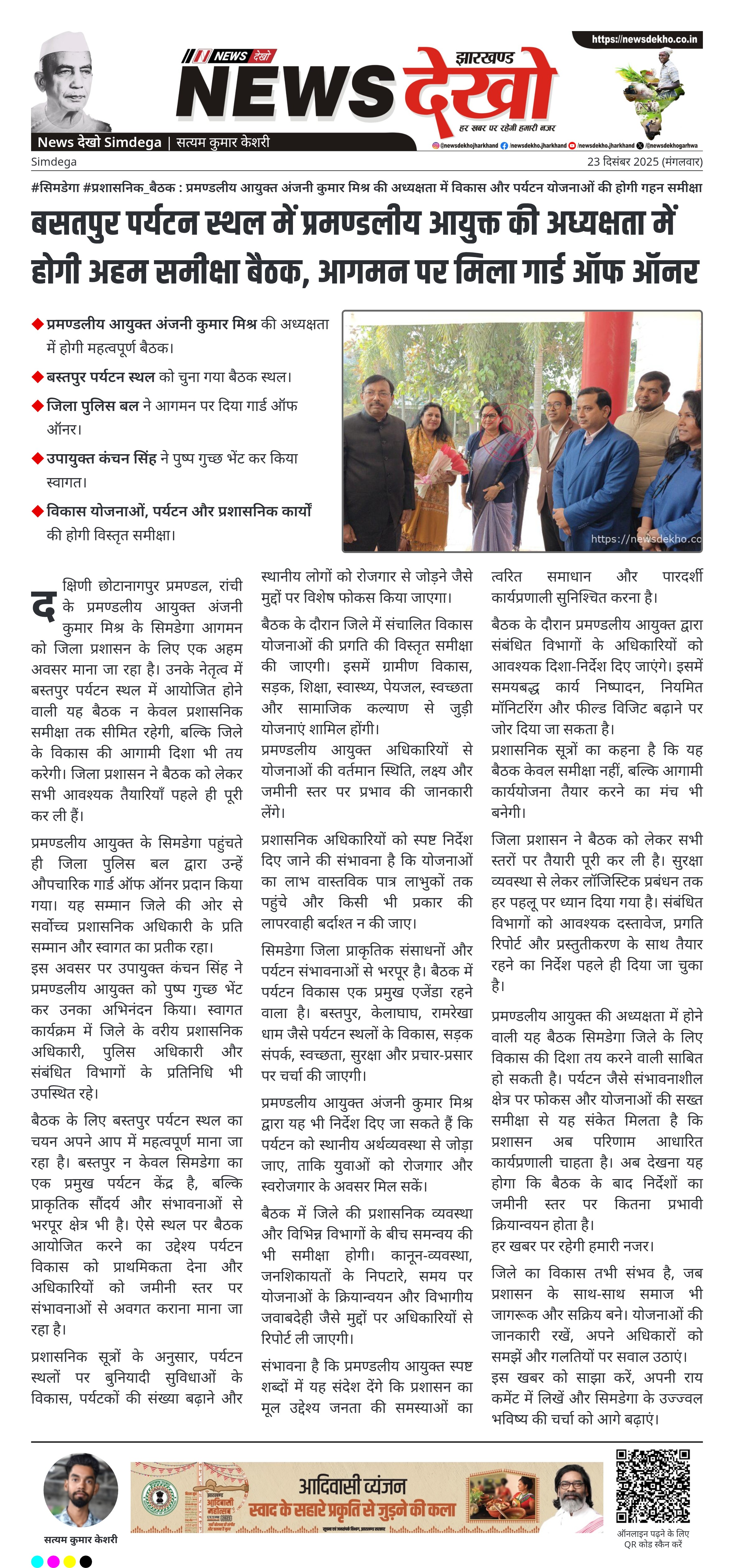 #सिमडेगा #प्रशासनिक_बैठक : प्रमण्डलीय आयुक्त अंजनी कुमार मिश्र की अध्यक्षता में विकास और पर्यटन योजनाओं की होगी गहन समीक्षा। प्रमण्डलीय आयुक्त अंजनी कुमार मिश्र की अध्यक्षता में होगी महत्वपूर्ण बैठक। बस्तपुर पर्यटन स्थल को चुना गया बैठक स्थल। जिला पुलिस बल ने आगमन पर दिया गार्ड ऑफ ऑनर। उपायुक्त कंचन…