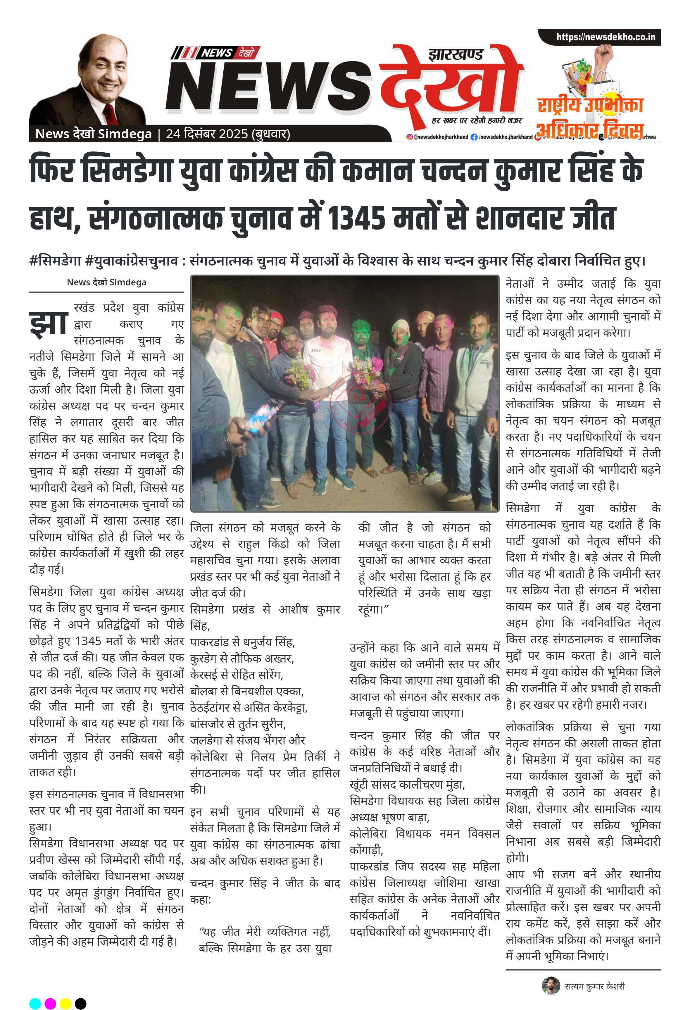 फिर सिमडेगा युवा कांग्रेस की कमान चन्दन कुमार सिंह के हाथ, संगठनात्मक चुनाव में 1345 मतों से शानदार जीत