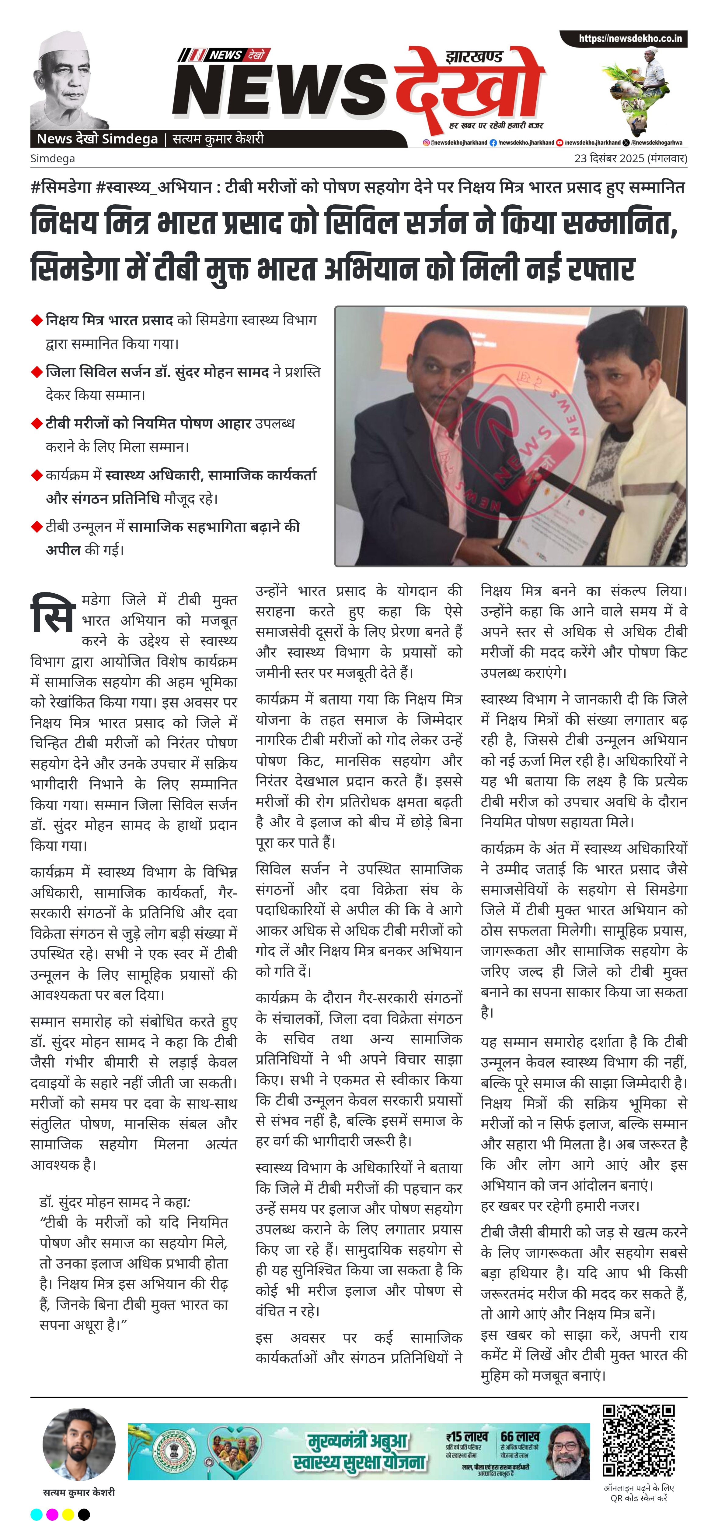 निक्षय मित्र भारत प्रसाद को सिविल सर्जन ने किया सम्मानित, सिमडेगा में टीबी मुक्त भारत अभियान को मिली नई रफ्तार