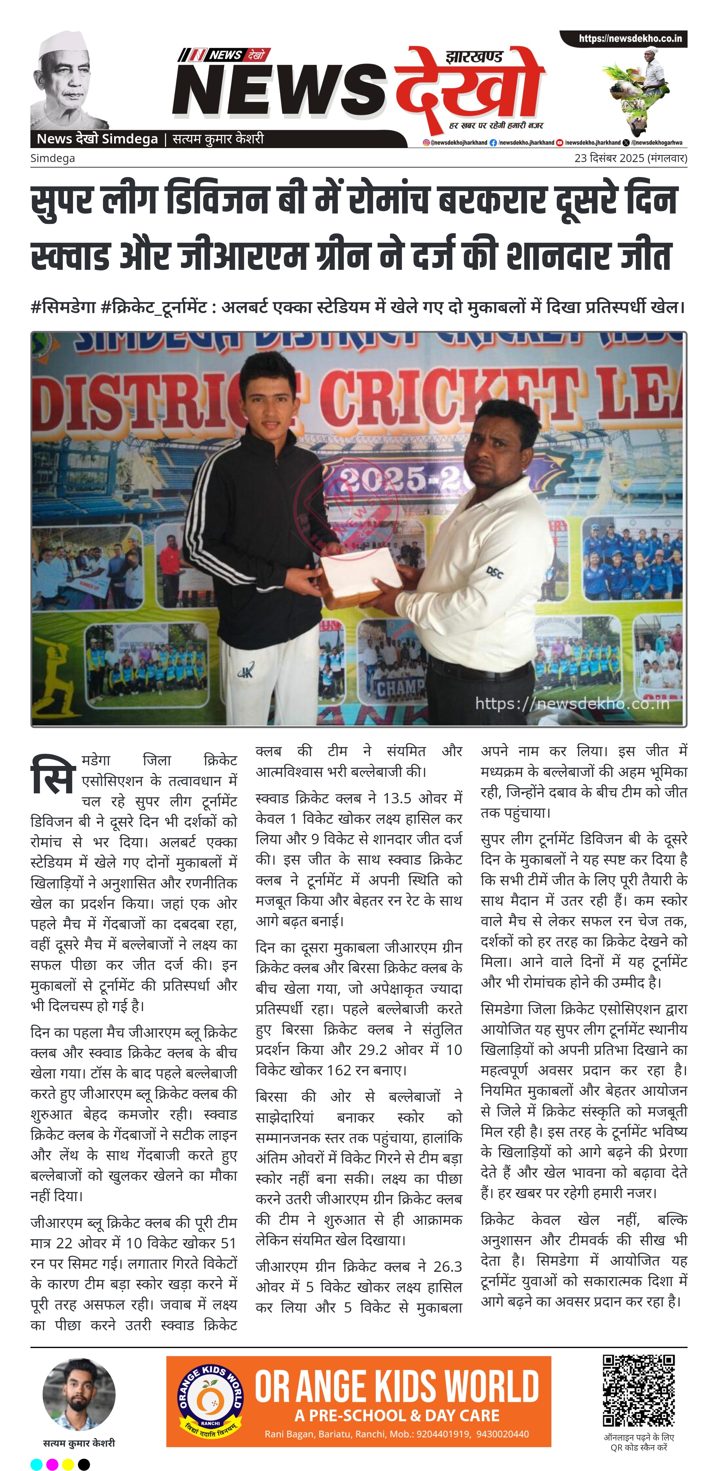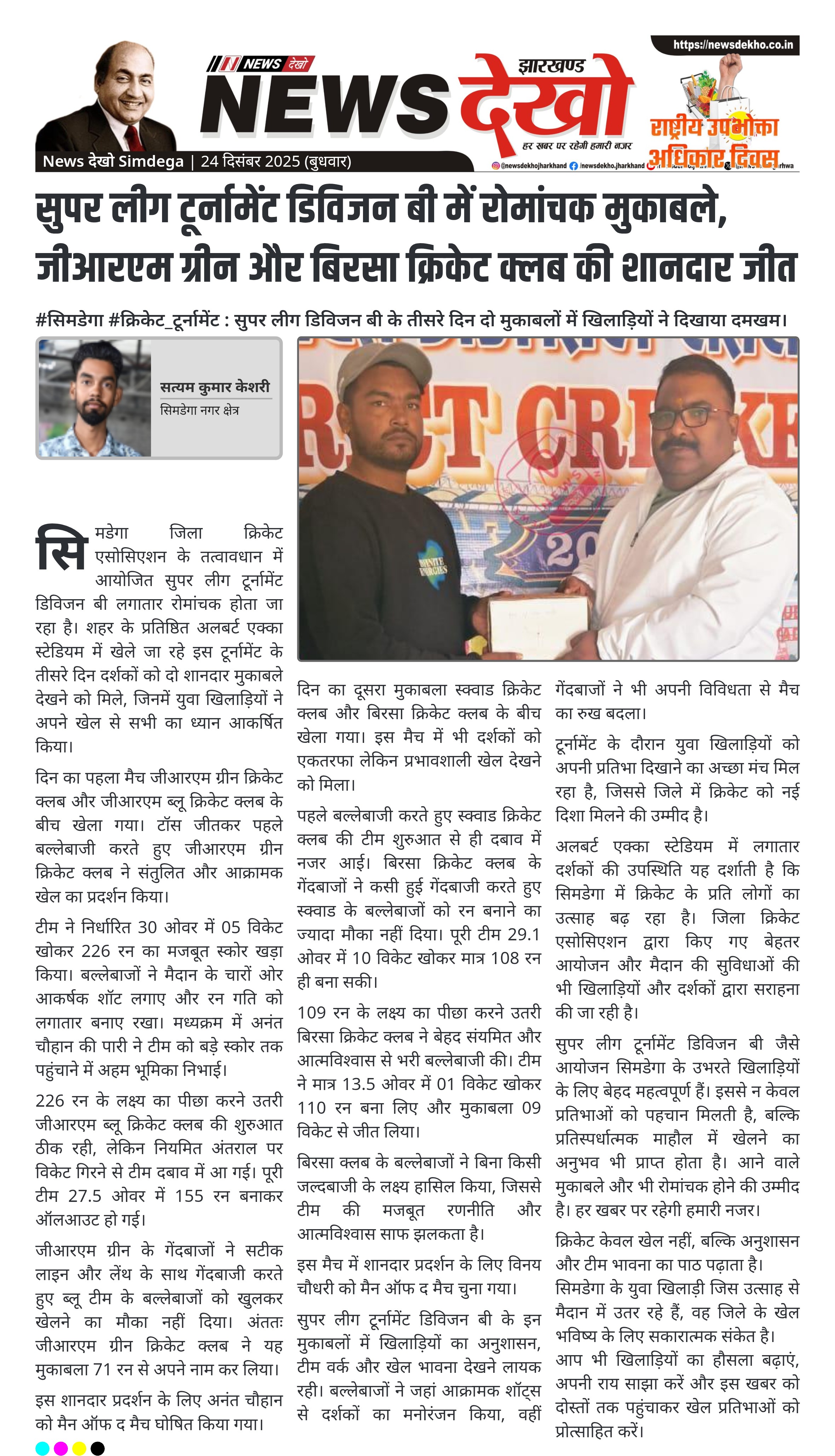 सुपर लीग टूर्नामेंट डिविजन बी में रोमांचक मुकाबले, जीआरएम ग्रीन और बिरसा क्रिकेट क्लब की शानदार जीत