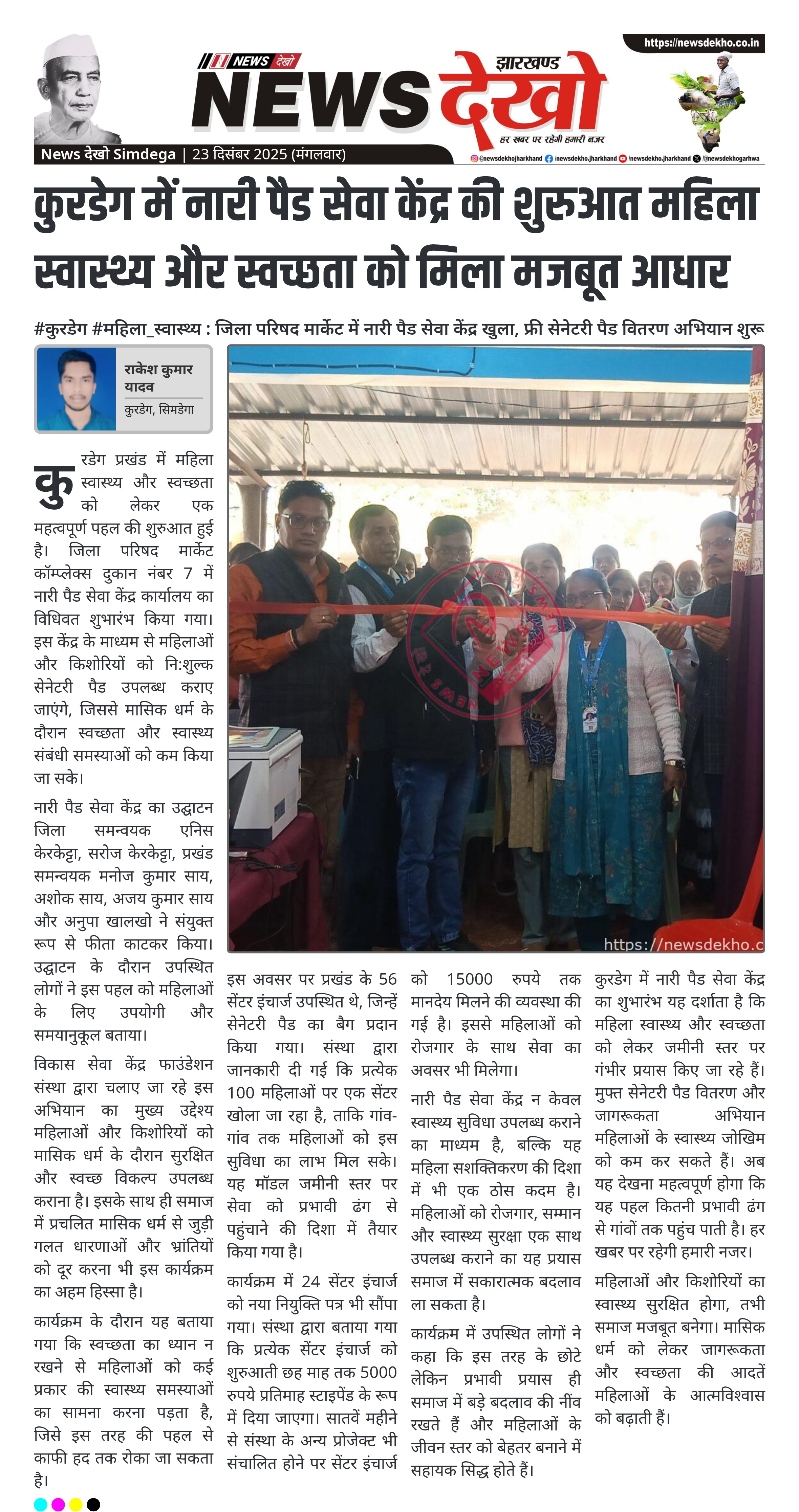 #कुरडेग #महिला_स्वास्थ्य : जिला परिषद मार्केट में नारी पैड सेवा केंद्र खुला, फ्री सेनेटरी पैड वितरण अभियान शुरू। जिला परिषद मार्केट कॉम्प्लेक्स, कुरडेग में नारी पैड सेवा केंद्र शुरू। विकास सेवा केंद्र फाउंडेशन द्वारा फ्री सेनेटरी पैड वितरण अभियान। उद्घाटन एनिस केरकेट्टा, सरोज केरकेट्टा सहित समन्वयकों ने किया। कार्यक्रम में…