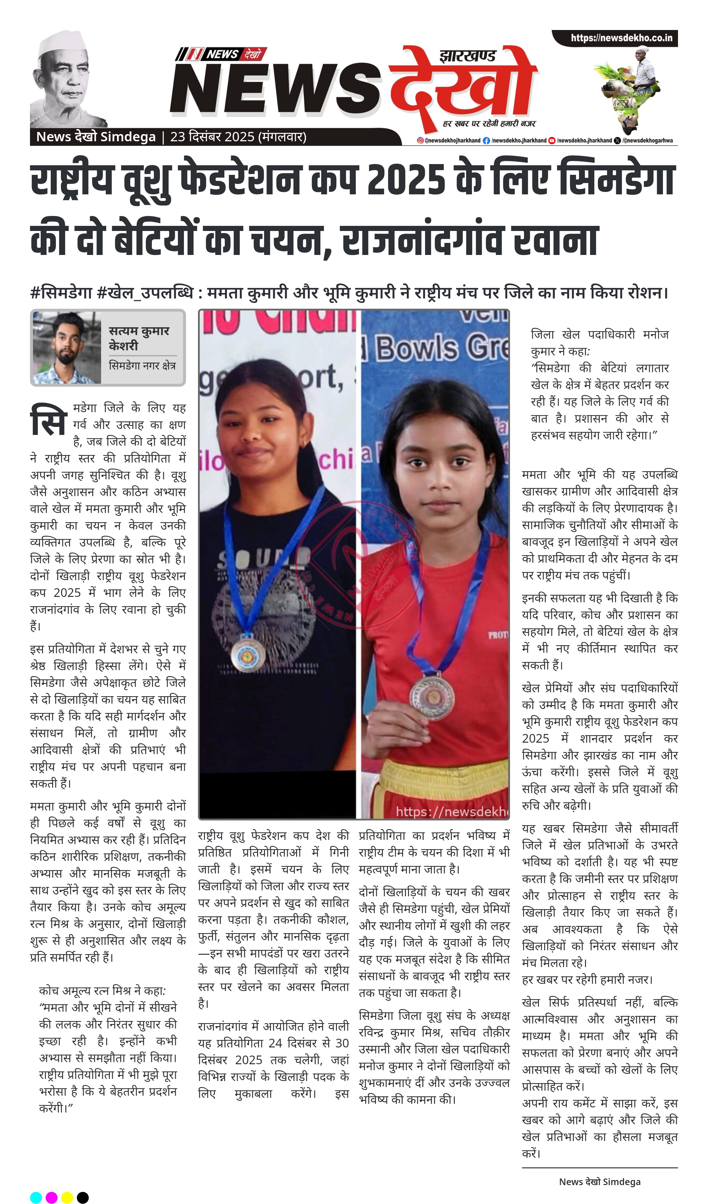 #सिमडेगा #खेल_उपलब्धि : ममता कुमारी और भूमि कुमारी ने राष्ट्रीय मंच पर जिले का नाम किया रोशन। ममता कुमारी और भूमि कुमारी का राष्ट्रीय वूशु फेडरेशन कप 2025 के लिए चयन। प्रतियोगिता 24 से 30 दिसंबर 2025 तक राजनांदगांव में आयोजित होगी। दोनों खिलाड़ी कोच अमूल्य रत्न मिश्र के प्रशिक्षण…