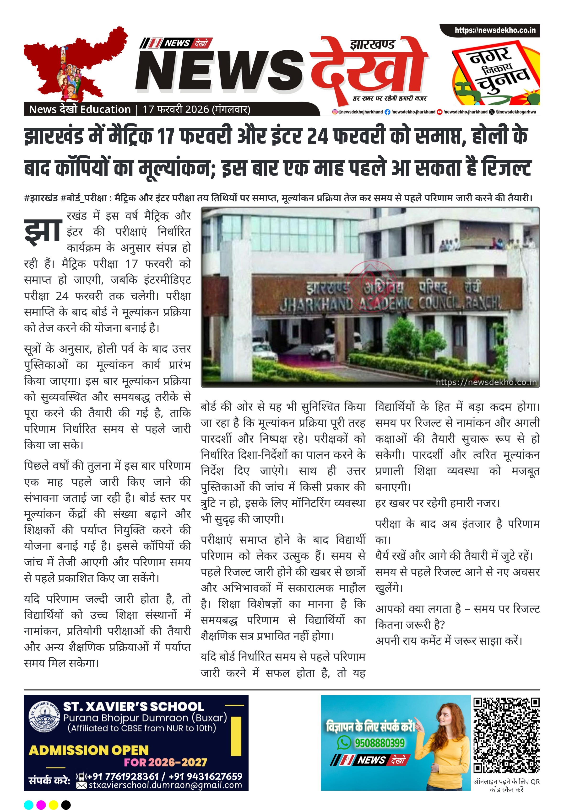 झारखंड में मैट्रिक परीक्षा 17 फरवरी और इंटर परीक्षा 24 फरवरी को समाप्त हो रही है। होली के बाद उत्तर पुस्तिकाओं का मूल्यांकन शुरू किया जाएगा। बोर्ड इस बार रिजल्ट एक माह पहले जारी करने की तैयारी में है, जिससे विद्यार्थियों को आगे की पढ़ाई में सहूलियत मिल सके।