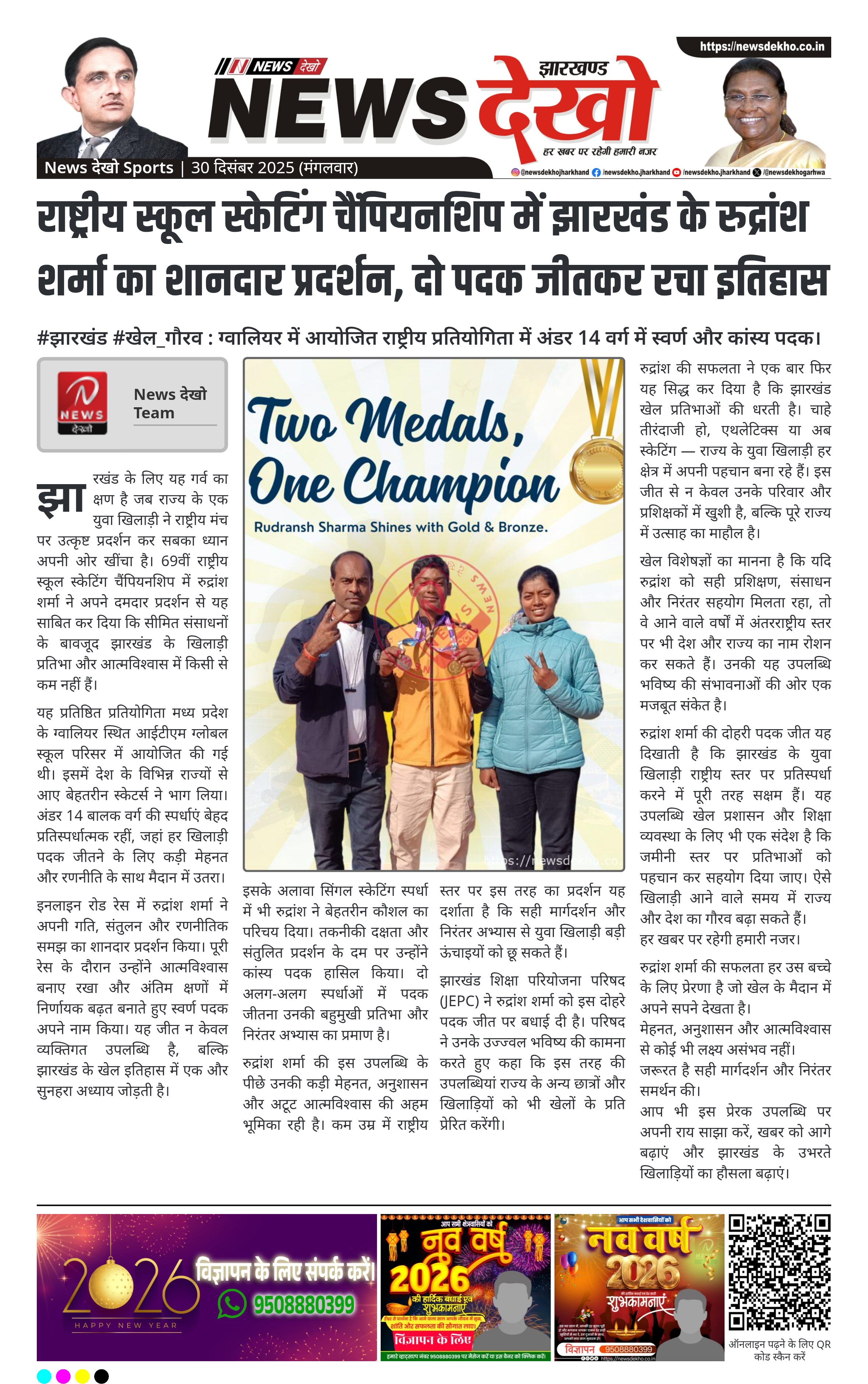 झारखंड के लिए यह गर्व का क्षण है जब राज्य के एक युवा खिलाड़ी ने राष्ट्रीय मंच पर उत्कृष्ट प्रदर्शन कर सबका ध्यान अपनी ओर खींचा है। 69वीं राष्ट्रीय स्कूल स्केटिंग चैंपियनशिप में रुद्रांश शर्मा ने अपने दमदार प्रदर्शन से यह साबित कर दिया कि सीमित संसाधनों के बावजूद झारखंड के खिलाड़ी प्रतिभा और आत्मविश्वास में किसी से कम नहीं हैं।