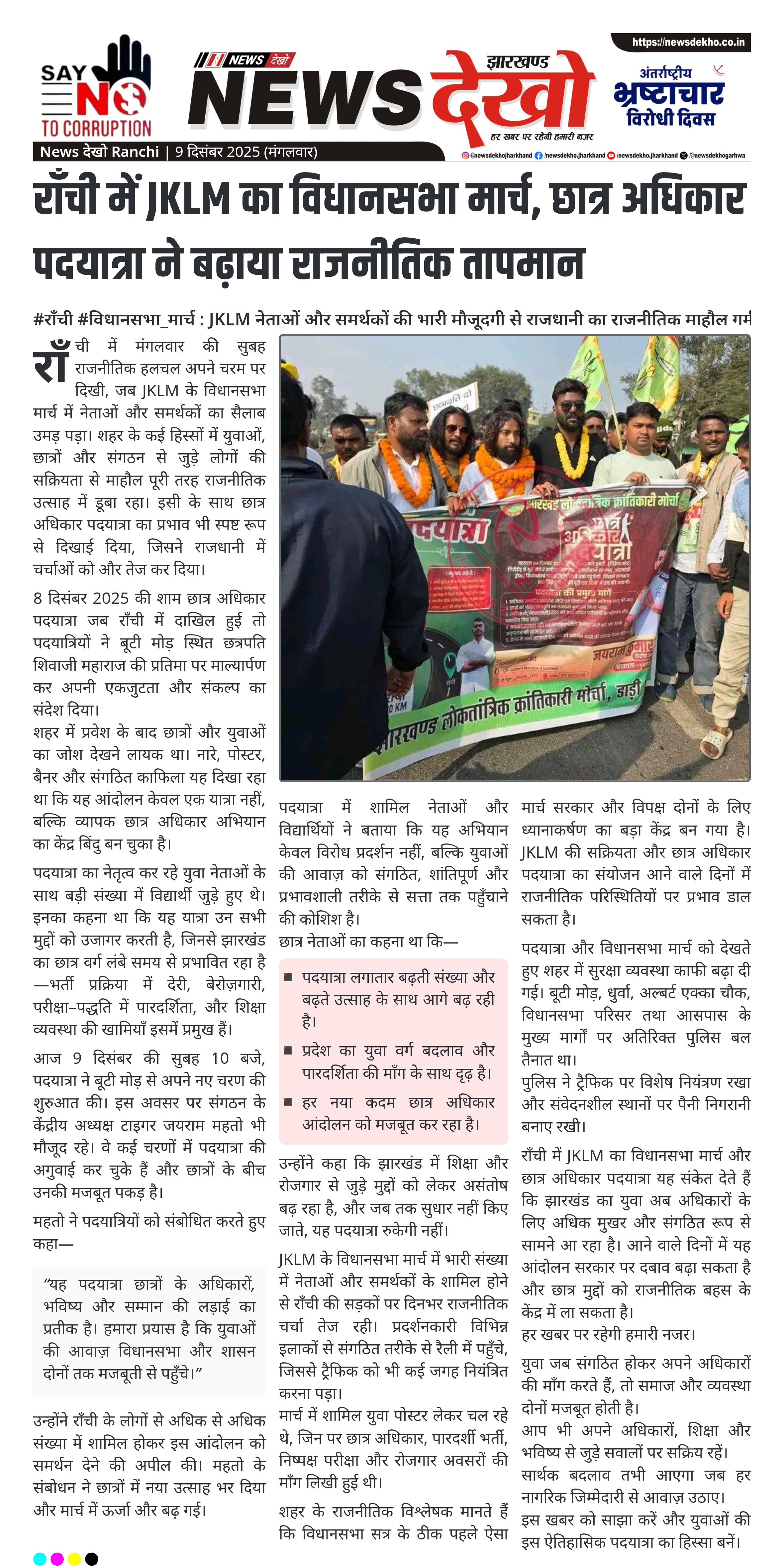 राँची में JKLM का विधानसभा मार्च और छात्र अधिकार पदयात्रा यह संकेत देते हैं कि झारखंड का युवा अब अधिकारों के लिए अधिक मुखर और संगठित रूप से सामने आ रहा है। आने वाले दिनों में यह आंदोलन सरकार पर दबाव बढ़ा सकता है और छात्र मुद्दों को राजनीतिक बहस के केंद्र में ला सकता है।