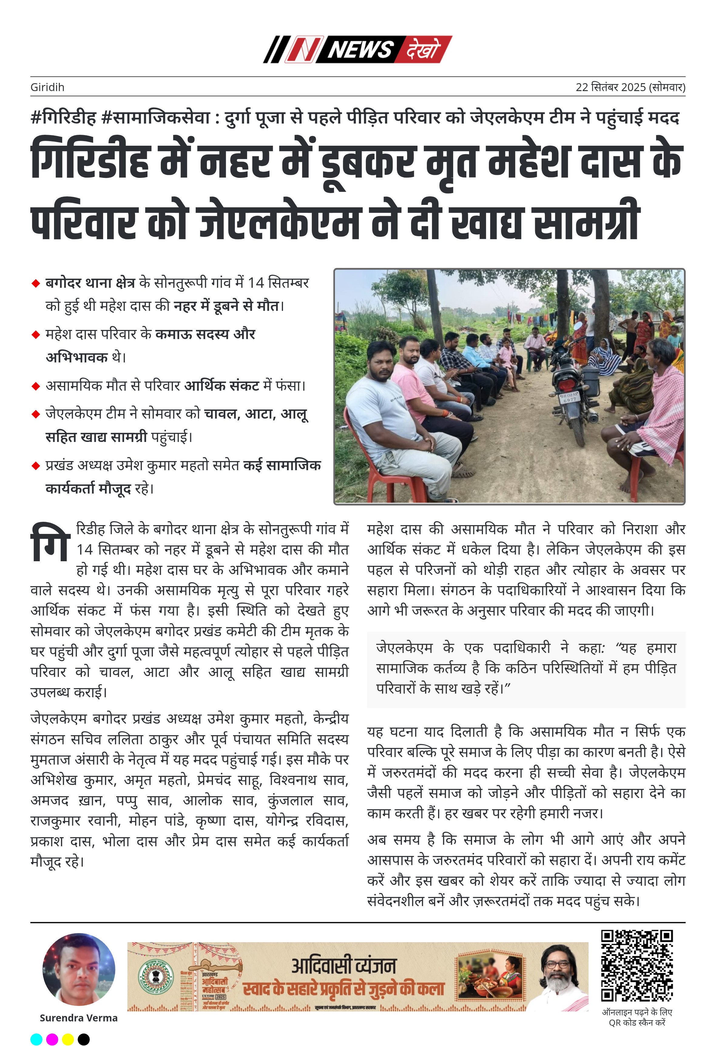 गिरिडीह में नहर में डूबकर मृत महेश दास के परिवार को जेएलकेएम ने दी खाद्य सामग्री
