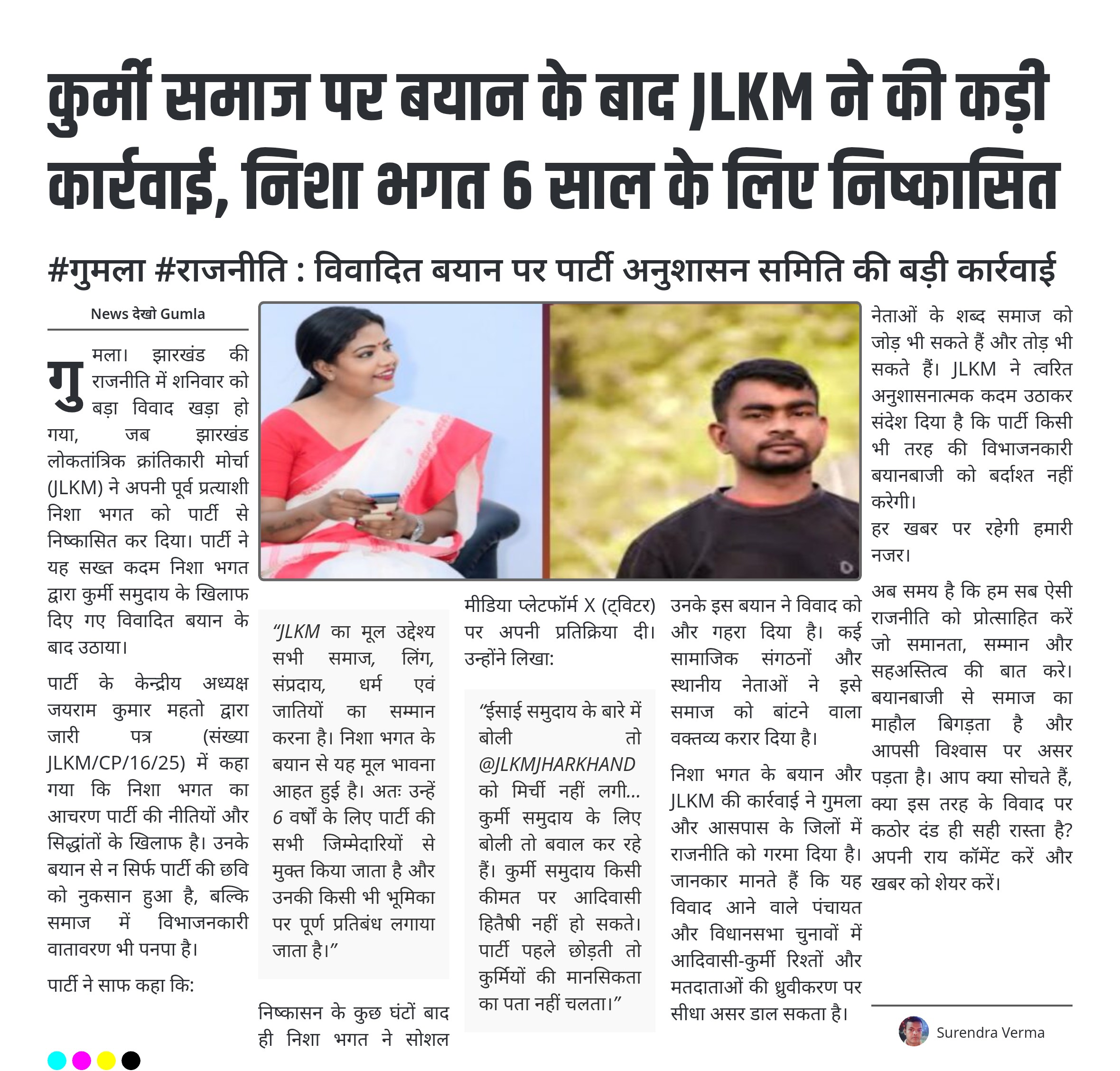 “JLKM का मूल उद्देश्य सभी समाज, लिंग, संप्रदाय, धर्म एवं जातियों का सम्मान करना है। निशा भगत के बयान से यह मूल भावना आहत हुई है। अतः उन्हें 6 वर्षों के लिए पार्टी की सभी जिम्मेदारियों से मुक्त किया जाता है और उनकी किसी भी भूमिका पर पूर्ण प्रतिबंध लगाया जाता है।”