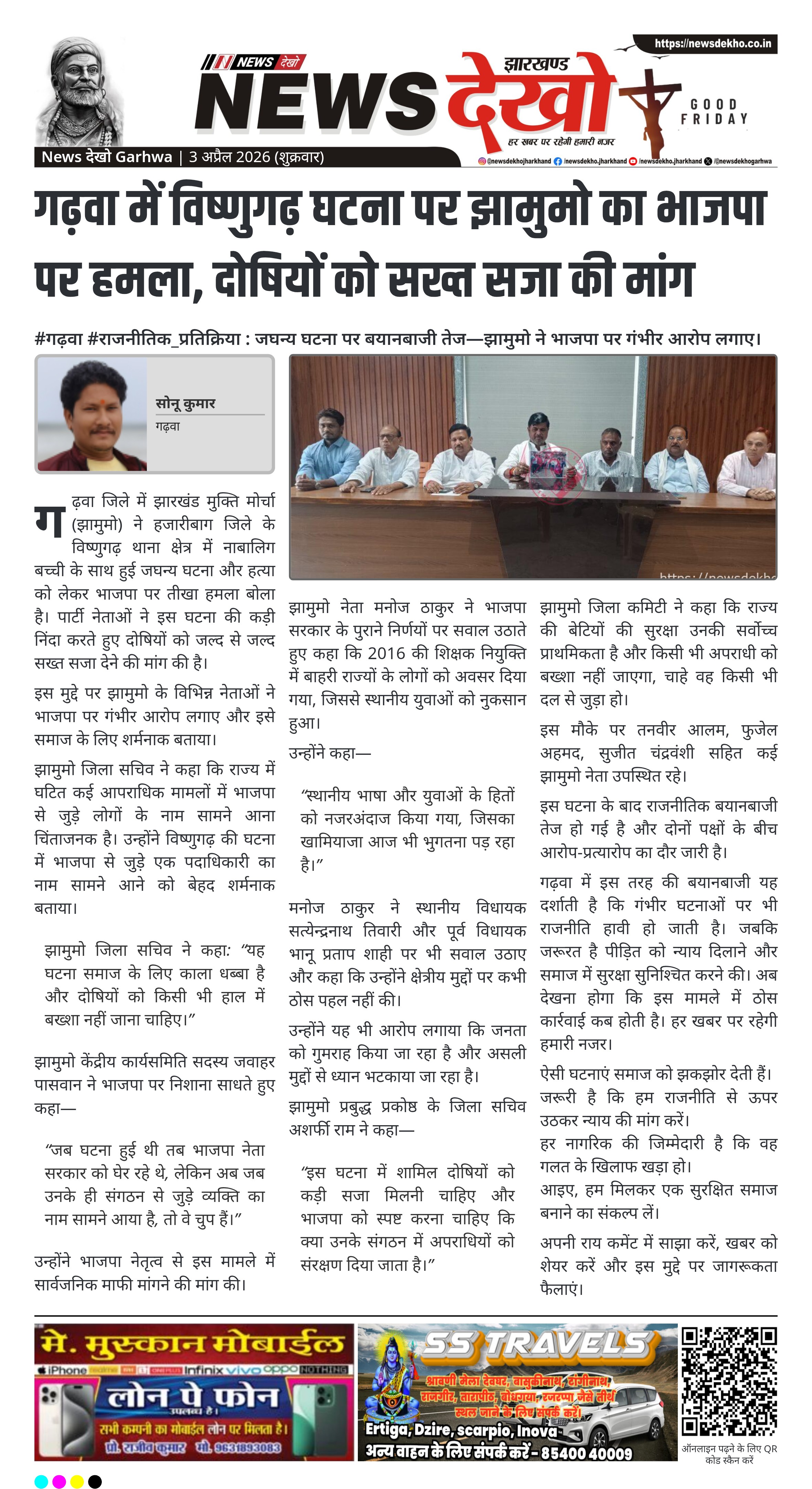 गढ़वा जिले में झारखंड मुक्ति मोर्चा (झामुमो) ने हजारीबाग जिले के विष्णुगढ़ थाना क्षेत्र में नाबालिग बच्ची के साथ हुई जघन्य घटना और हत्या को लेकर भाजपा पर तीखा हमला बोला है। पार्टी नेताओं ने इस घटना की कड़ी निंदा करते हुए दोषियों को जल्द से जल्द सख्त सजा देने की मांग की है।