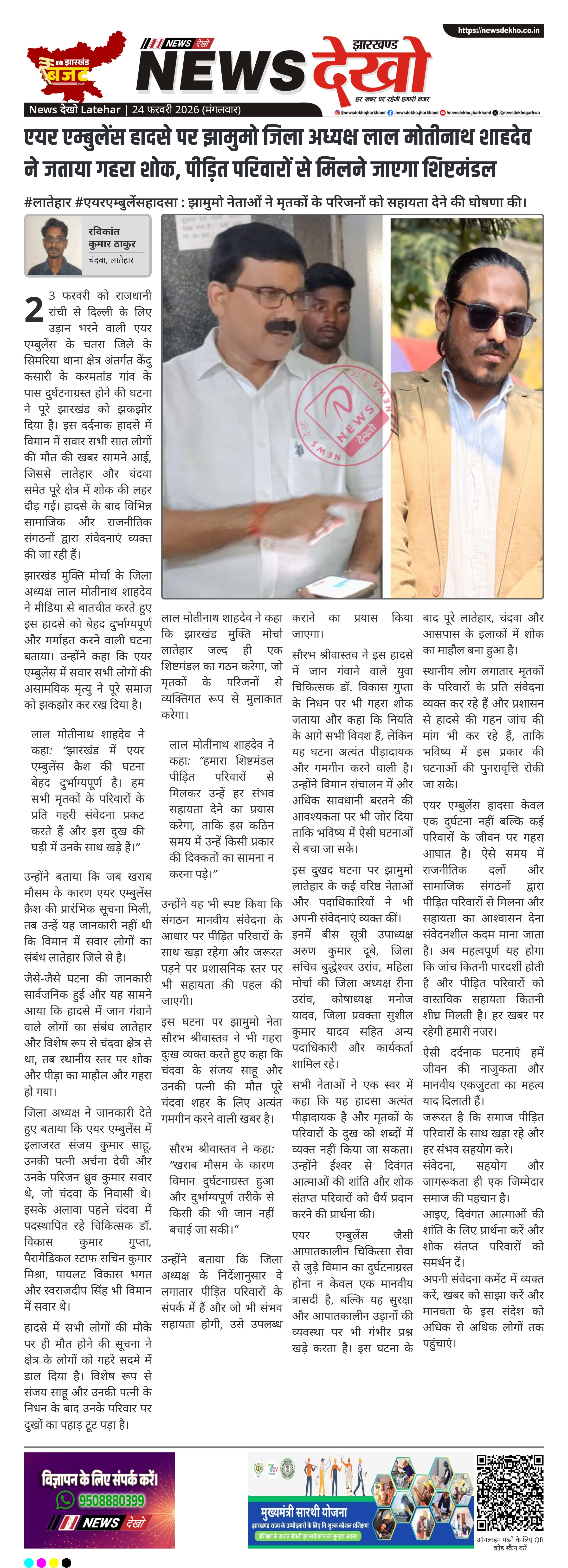 लाल मोतीनाथ शाहदेव ने कहा: “झारखंड में एयर एम्बुलेंस क्रैश की घटना बेहद दुर्भाग्यपूर्ण है। हम सभी मृतकों के परिवारों के प्रति गहरी संवेदना प्रकट करते हैं और इस दुख की घड़ी में उनके साथ खड़े हैं।”