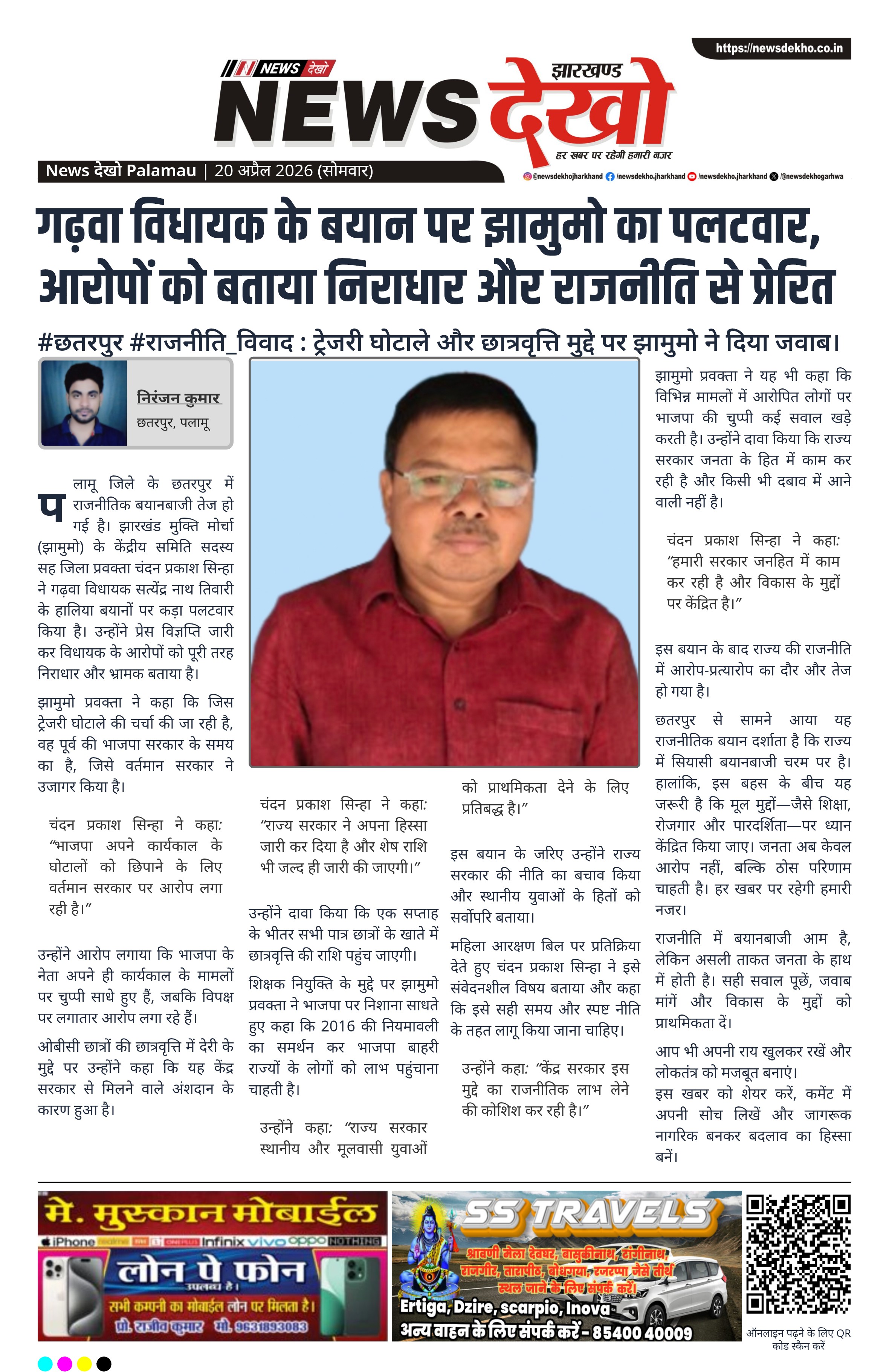 - झामुमो प्रवक्ता चंदन प्रकाश सिन्हा ने भाजपा पर किया पलटवार।