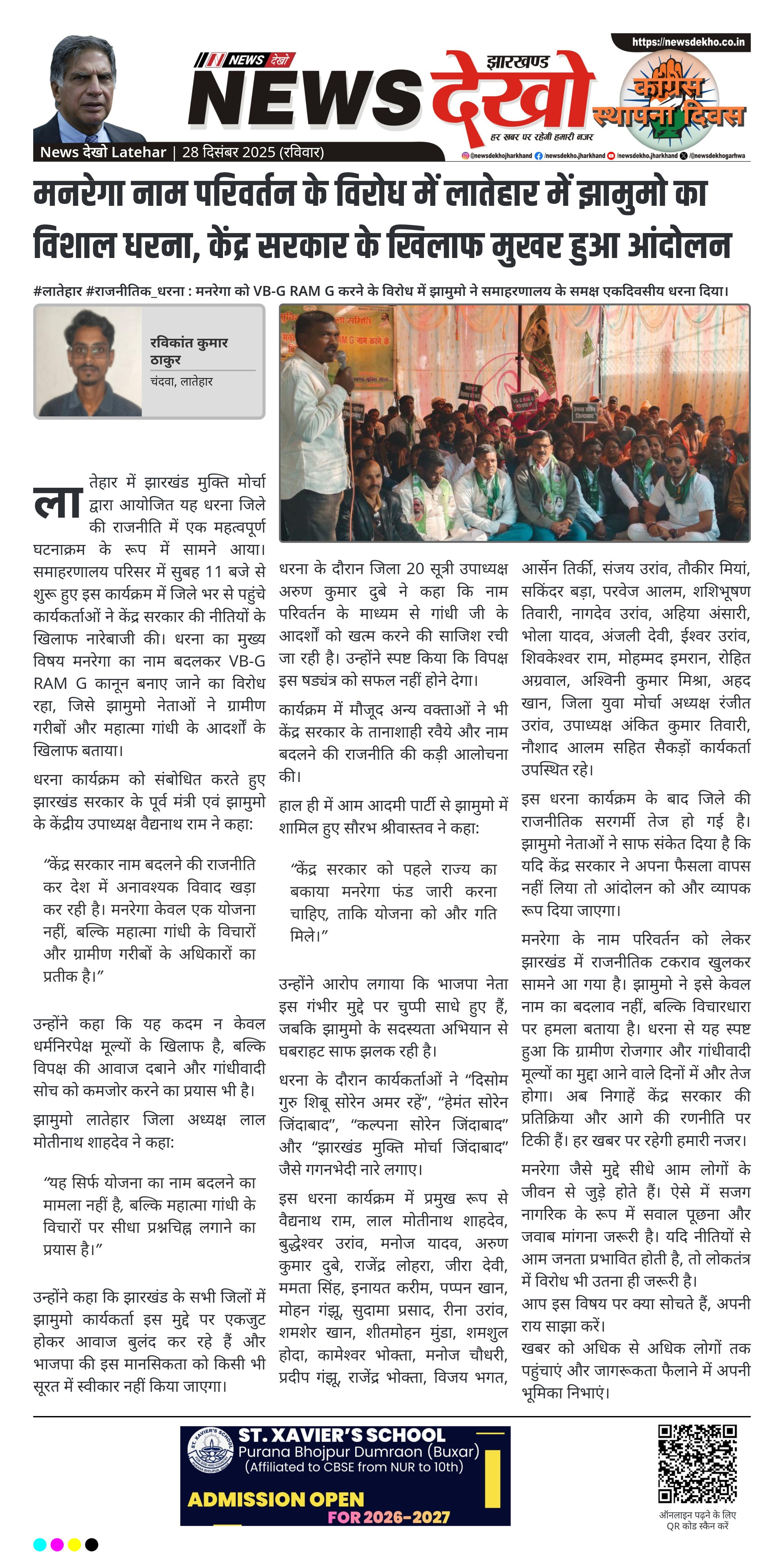 केंद्र सरकार द्वारा मनरेगा का नाम बदलकर VB-G RAM G कानून पारित किए जाने के विरोध में झारखंड मुक्ति मोर्चा लातेहार जिला इकाई ने 27 दिसंबर 2025 को समाहरणालय परिसर में एकदिवसीय धरना आयोजित किया। धरना में बड़ी संख्या में झामुमो पदाधिकारी, कार्यकर्ता और समर्थक शामिल हुए। कार्यक्रम में केंद्र की नीति को महात्मा गांधी के विचारों पर हमला बताते हुए कड़ा विरोध दर्ज कराया गया। नेताओं ने चेतावनी दी कि यह संघर्ष सड़क से लेकर सदन तक जारी रहेगा।