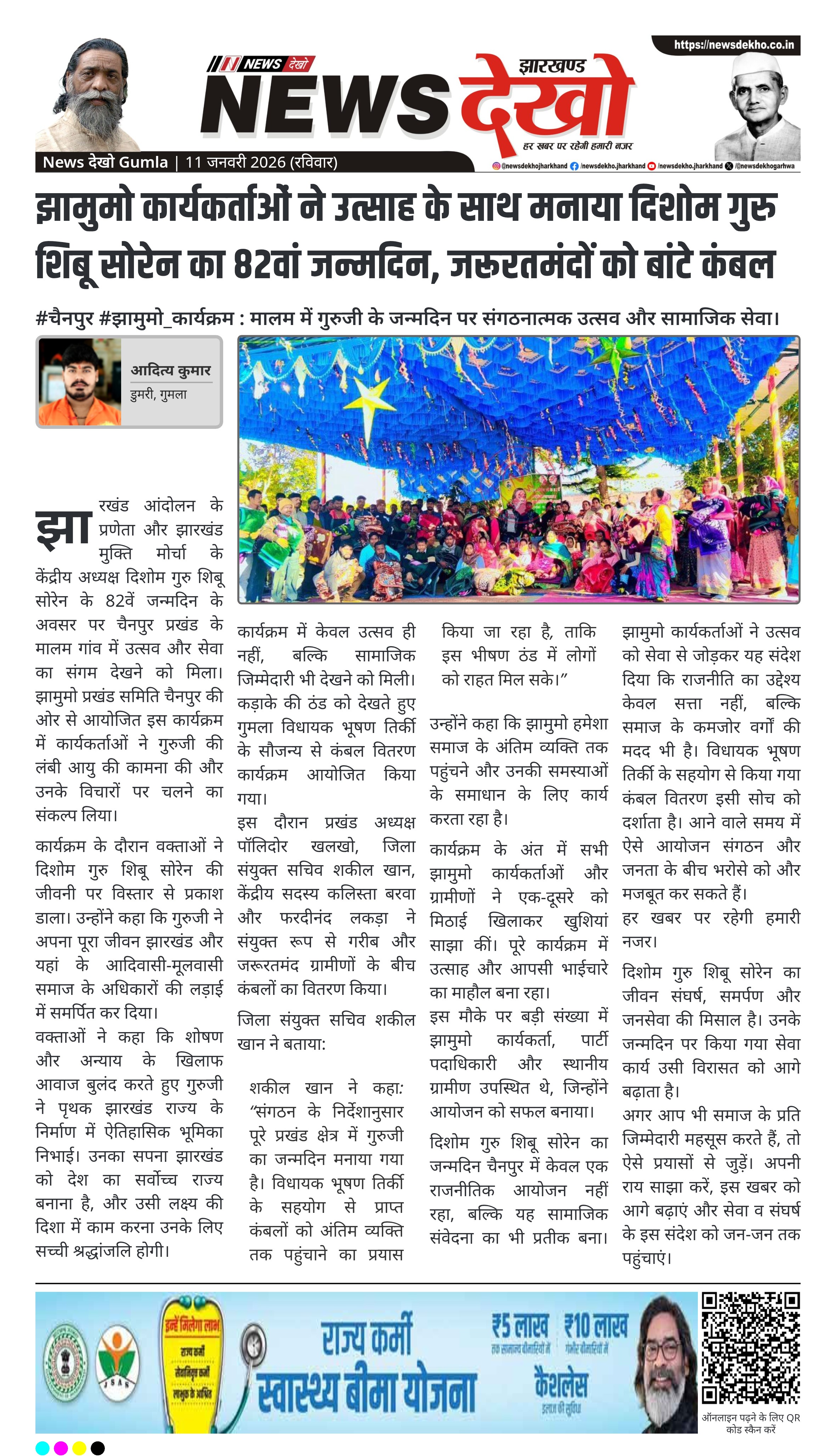 शकील खान ने कहा: “संगठन के निर्देशानुसार पूरे प्रखंड क्षेत्र में गुरुजी का जन्मदिन मनाया गया है। विधायक भूषण तिर्की के सहयोग से प्राप्त कंबलों को अंतिम व्यक्ति तक पहुंचाने का प्रयास किया जा रहा है, ताकि इस भीषण ठंड में लोगों को राहत मिल सके।”