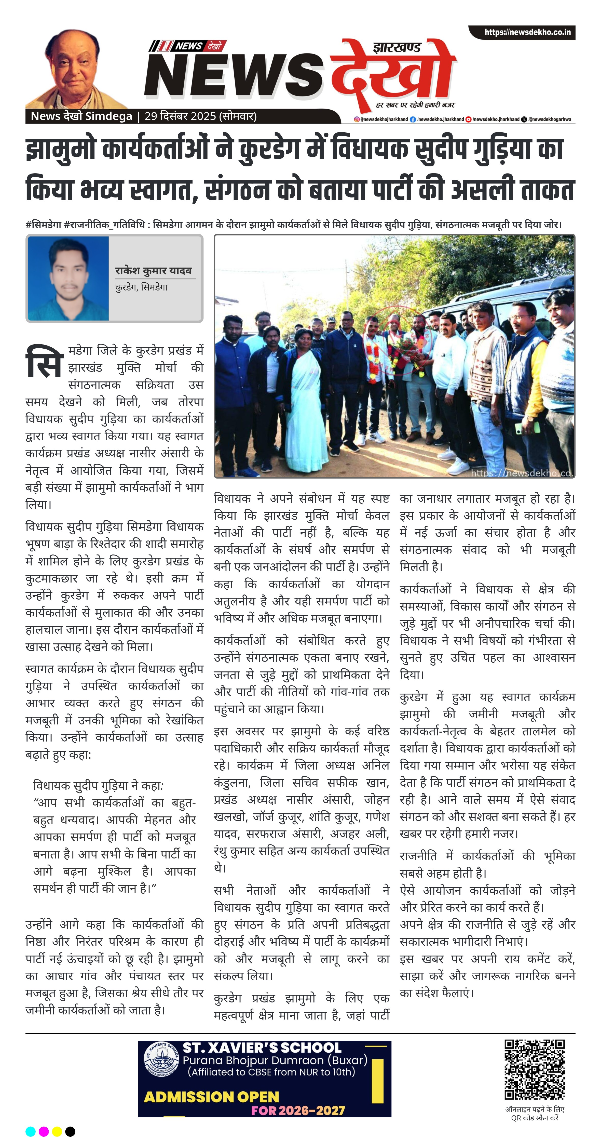 सिमडेगा जिले के कुरडेग प्रखंड में झारखंड मुक्ति मोर्चा की संगठनात्मक सक्रियता उस समय देखने को मिली, जब तोरपा विधायक सुदीप गुड़िया का कार्यकर्ताओं द्वारा भव्य स्वागत किया गया। यह स्वागत कार्यक्रम प्रखंड अध्यक्ष नासीर अंसारी के नेतृत्व में आयोजित किया गया, जिसमें बड़ी संख्या में झामुमो कार्यकर्ताओं ने भाग लिया।