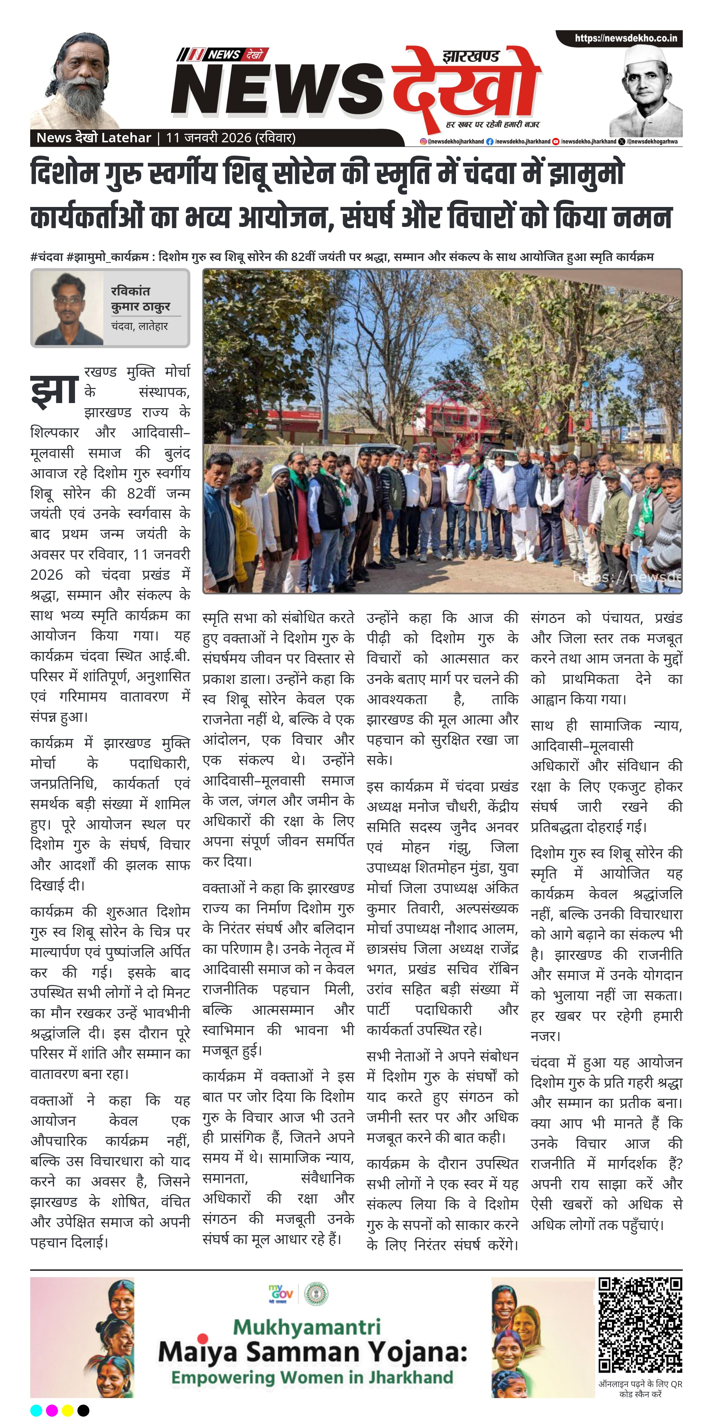 झारखण्ड मुक्ति मोर्चा के संस्थापक, झारखण्ड राज्य के शिल्पकार और आदिवासी–मूलवासी समाज की बुलंद आवाज रहे दिशोम गुरु स्वर्गीय शिबू सोरेन की 82वीं जन्म जयंती एवं उनके स्वर्गवास के बाद प्रथम जन्म जयंती के अवसर पर रविवार, 11 जनवरी 2026 को चंदवा प्रखंड में श्रद्धा, सम्मान और संकल्प के साथ भव्य स्मृति कार्यक्रम का आयोजन किया गया। यह कार्यक्रम चंदवा स्थित आई.बी. परिसर में शांतिपूर्ण, अनुशासित एवं गरिमामय वातावरण में संपन्न हुआ।