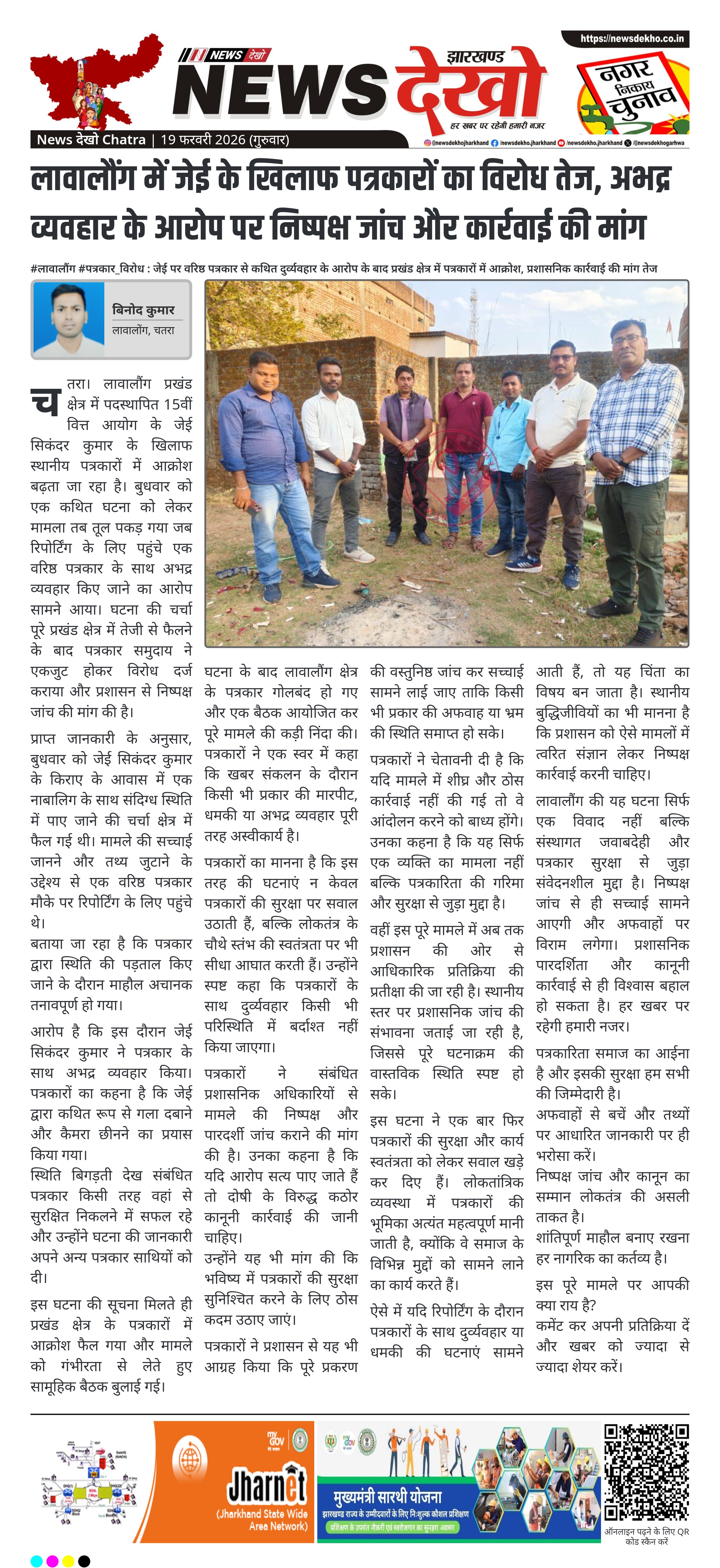 चतरा। लावालौंग प्रखंड क्षेत्र में पदस्थापित 15वीं वित्त आयोग के जेई सिकंदर कुमार के खिलाफ स्थानीय पत्रकारों में आक्रोश बढ़ता जा रहा है। बुधवार को एक कथित घटना को लेकर मामला तब तूल पकड़ गया जब रिपोर्टिंग के लिए पहुंचे एक वरिष्ठ पत्रकार के साथ अभद्र व्यवहार किए जाने का आरोप सामने आया। घटना की चर्चा पूरे प्रखंड क्षेत्र में तेजी से फैलने के बाद पत्रकार समुदाय ने एकजुट होकर विरोध दर्ज कराया और प्रशासन से निष्पक्ष जांच की मांग की है।
