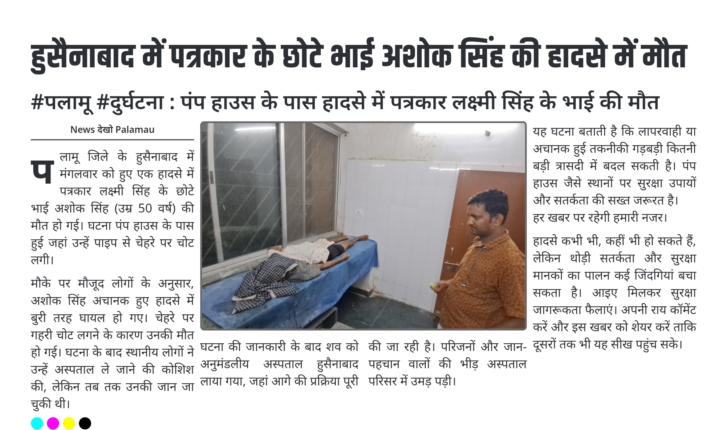 पलामू जिले के हुसैनाबाद में मंगलवार को हुए एक हादसे में पत्रकार लक्ष्मी सिंह के छोटे भाई अशोक सिंह (उम्र 50 वर्ष) की मौत हो गई। घटना पंप हाउस के पास हुई जहां उन्हें पाइप से चेहरे पर चोट लगी।