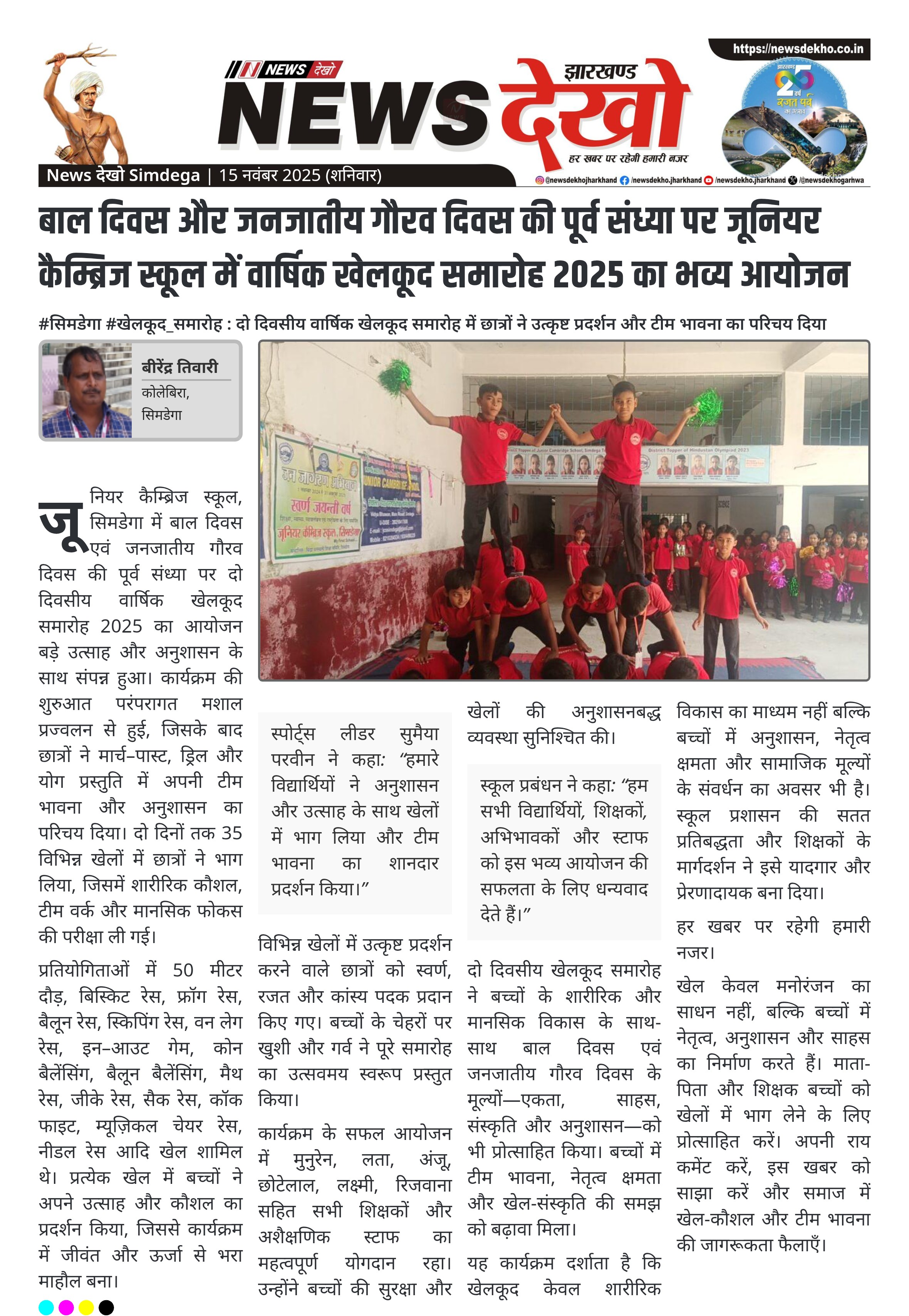 जूनियर कैम्ब्रिज स्कूल, सिमडेगा में बाल दिवस एवं जनजातीय गौरव दिवस की पूर्व संध्या पर दो दिवसीय वार्षिक खेलकूद समारोह 2025 का आयोजन बड़े उत्साह और अनुशासन के साथ संपन्न हुआ। कार्यक्रम की शुरुआत परंपरागत मशाल प्रज्वलन से हुई, जिसके बाद छात्रों ने मार्च–पास्ट, ड्रिल और योग प्रस्तुति में अपनी टीम भावना और अनुशासन का परिचय दिया। दो दिनों तक 35 विभिन्न खेलों में छात्रों ने भाग लिया, जिसमें शारीरिक कौशल, टीम वर्क और मानसिक फोकस की परीक्षा ली गई।