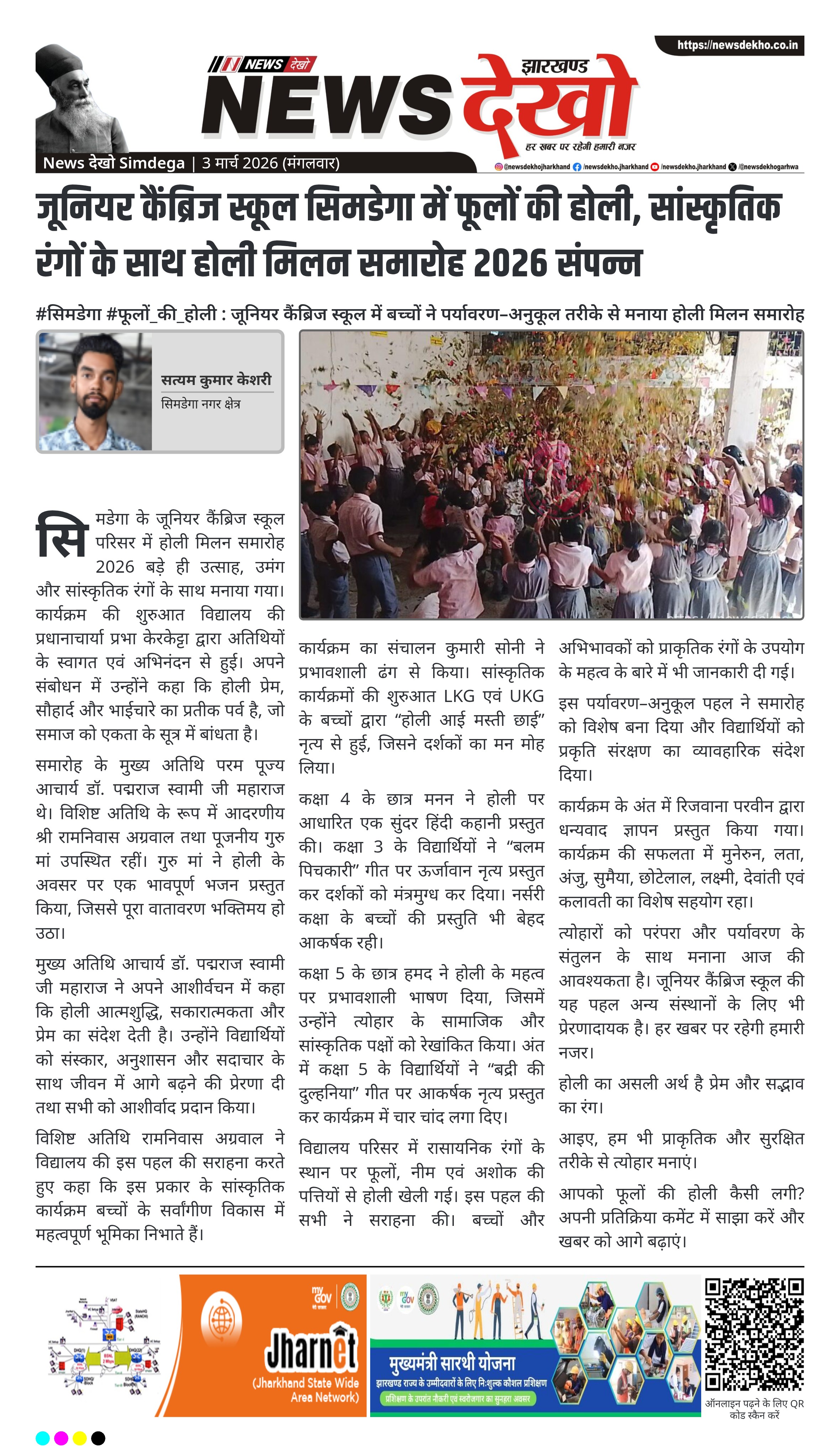 - जूनियर कैंब्रिज स्कूल, सिमडेगा में मनाया गया होली मिलन समारोह 2026।