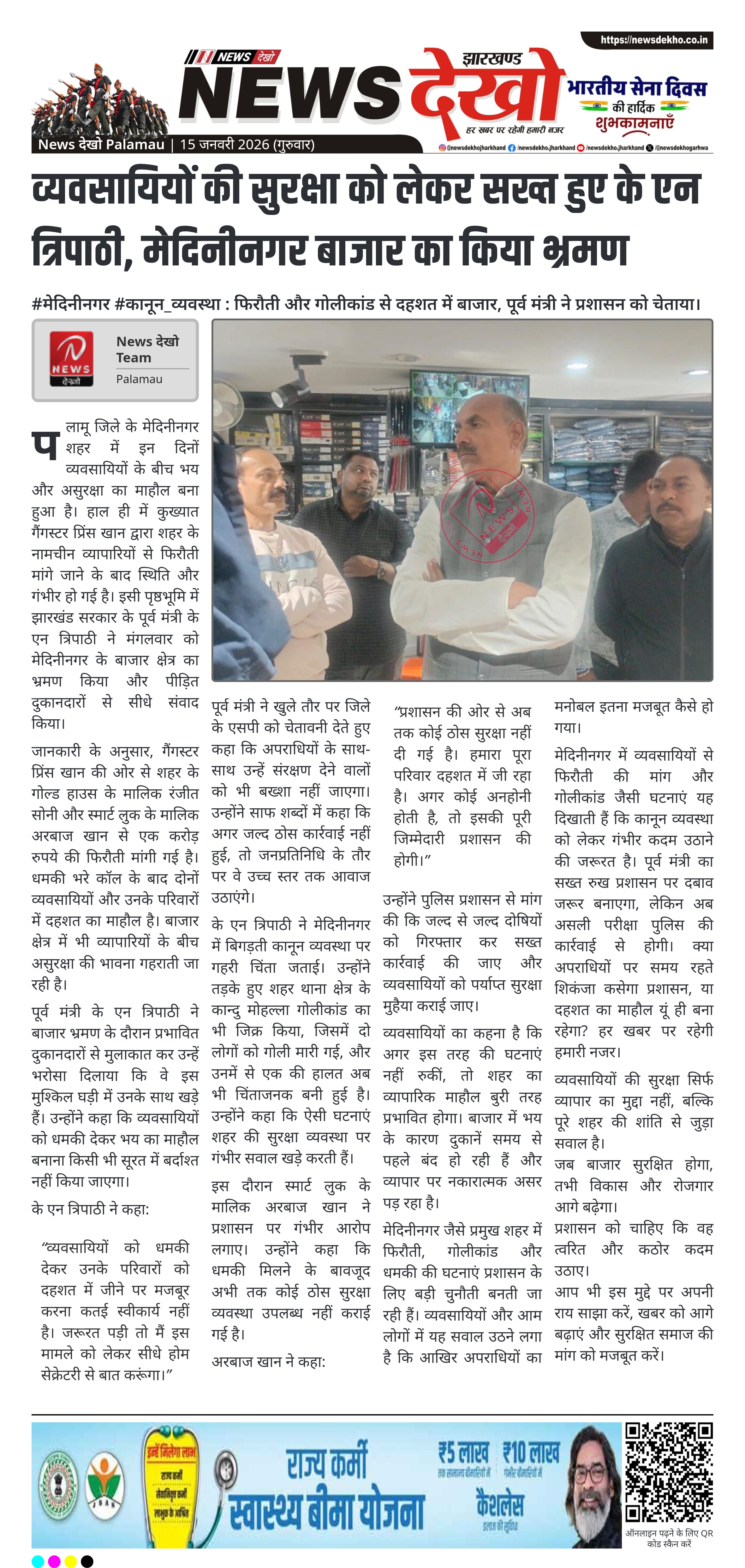पलामू जिले के मेदिनीनगर में व्यवसायियों को मिल रही धमकियों और बिगड़ती कानून व्यवस्था को लेकर पूर्व मंत्री के एन त्रिपाठी ने बाजार क्षेत्र का दौरा किया। उन्होंने हाल ही में फिरौती की धमकी झेल रहे दुकानदारों से मुलाकात कर सुरक्षा का भरोसा दिलाया। इस दौरान उन्होंने पुलिस प्रशासन को कड़ी चेतावनी देते हुए अपराधियों और उन्हें संरक्षण देने वालों पर सख्त कार्रवाई की मांग की। मामला जिले की कानून व्यवस्था और व्यापारिक सुरक्षा से जुड़ा होने के कारण बेहद अहम माना जा रहा है।