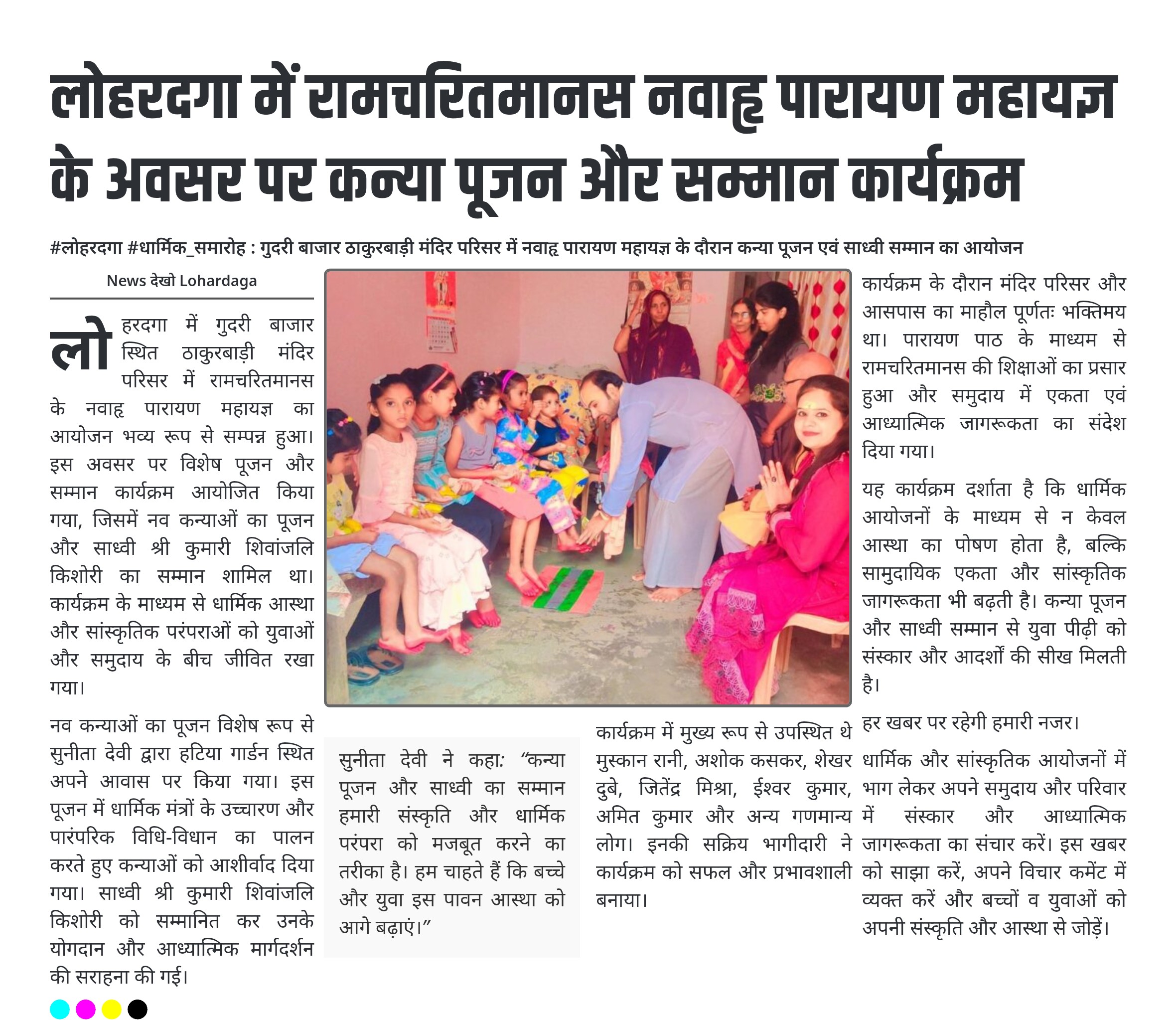 लोहरदगा में गुदरी बाजार स्थित ठाकुरबाड़ी मंदिर परिसर में रामचरितमानस के नवाहृ पारायण महायज्ञ का आयोजन भव्य रूप से सम्पन्न हुआ। इस अवसर पर विशेष पूजन और सम्मान कार्यक्रम आयोजित किया गया, जिसमें नव कन्याओं का पूजन और साध्वी श्री कुमारी शिवांजलि किशोरी का सम्मान शामिल था। कार्यक्रम के माध्यम से धार्मिक आस्था और सांस्कृतिक परंपराओं को युवाओं और समुदाय के बीच जीवित रखा गया।