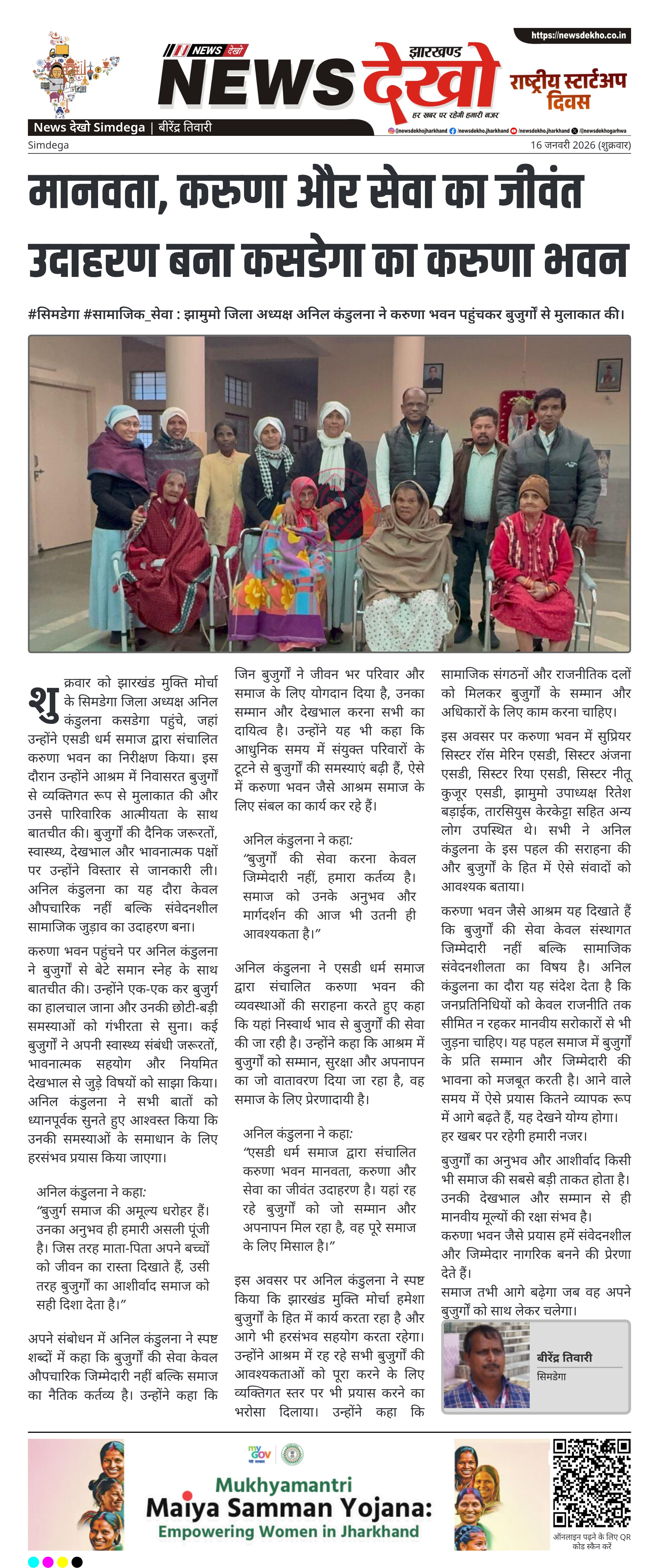 शुक्रवार को झारखंड मुक्ति मोर्चा के सिमडेगा जिला अध्यक्ष अनिल कंडुलना कसडेगा पहुंचे, जहां उन्होंने एसडी धर्म समाज द्वारा संचालित करुणा भवन का निरीक्षण किया। इस दौरान उन्होंने आश्रम में निवासरत बुजुर्गों से व्यक्तिगत रूप से मुलाकात की और उनसे पारिवारिक आत्मीयता के साथ बातचीत की। बुजुर्गों की दैनिक जरूरतों, स्वास्थ्य, देखभाल और भावनात्मक पक्षों पर उन्होंने विस्तार से जानकारी ली। अनिल कंडुलना का यह दौरा केवल औपचारिक नहीं बल्कि संवेदनशील सामाजिक जुड़ाव का उदाहरण बना।