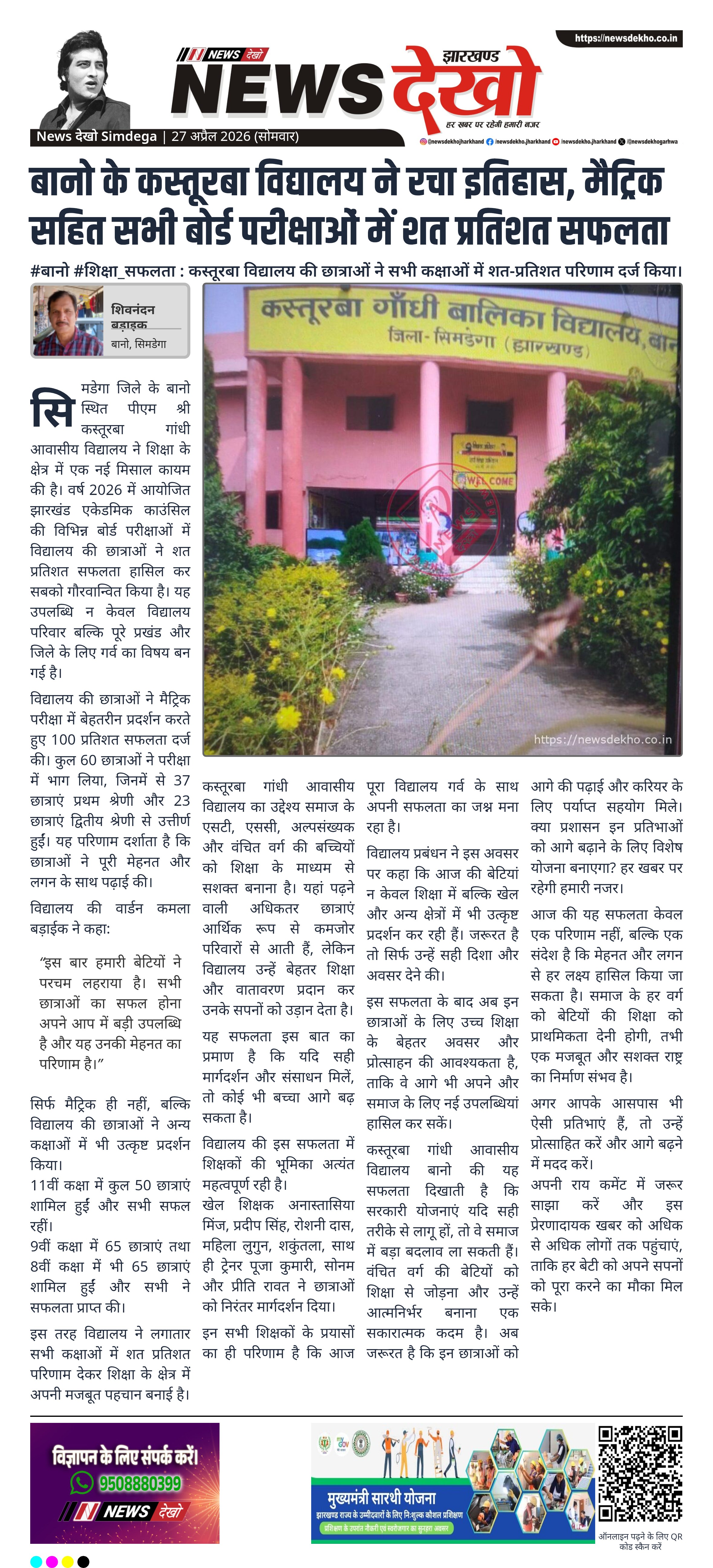 सिमडेगा जिले के बानो स्थित कस्तूरबा गांधी आवासीय विद्यालय ने वर्ष 2026 की बोर्ड परीक्षाओं में ऐतिहासिक सफलता हासिल की है। मैट्रिक परीक्षा में विद्यालय की सभी छात्राएं सफल रहीं, वहीं 8वीं, 9वीं और 11वीं कक्षाओं में भी शत प्रतिशत परिणाम दर्ज किया गया। इस उपलब्धि ने न केवल विद्यालय बल्कि पूरे प्रखंड का नाम रोशन किया है। यह सफलता छात्राओं की मेहनत और शिक्षकों के मार्गदर्शन का परिणाम मानी जा रही है।