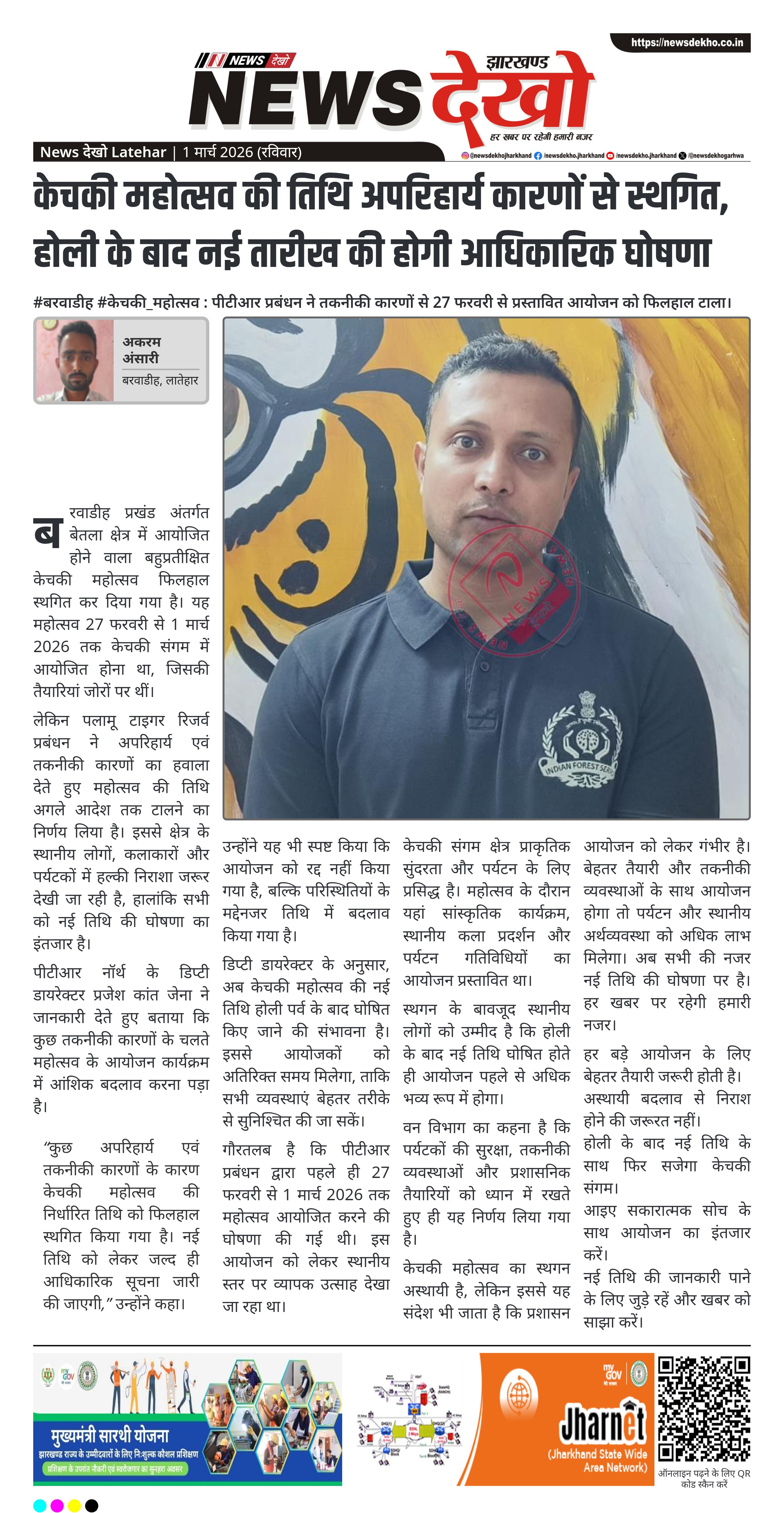 बरवाडीह के बेतला क्षेत्र में आयोजित होने वाला बहुप्रतीक्षित केचकी महोत्सव फिलहाल स्थगित कर दिया गया है। पलामू टाइगर रिजर्व प्रबंधन ने अपरिहार्य एवं तकनीकी कारणों का हवाला देते हुए 27 फरवरी से 1 मार्च तक प्रस्तावित आयोजन को टाल दिया। नई तिथि अब होली के बाद घोषित की जाएगी।