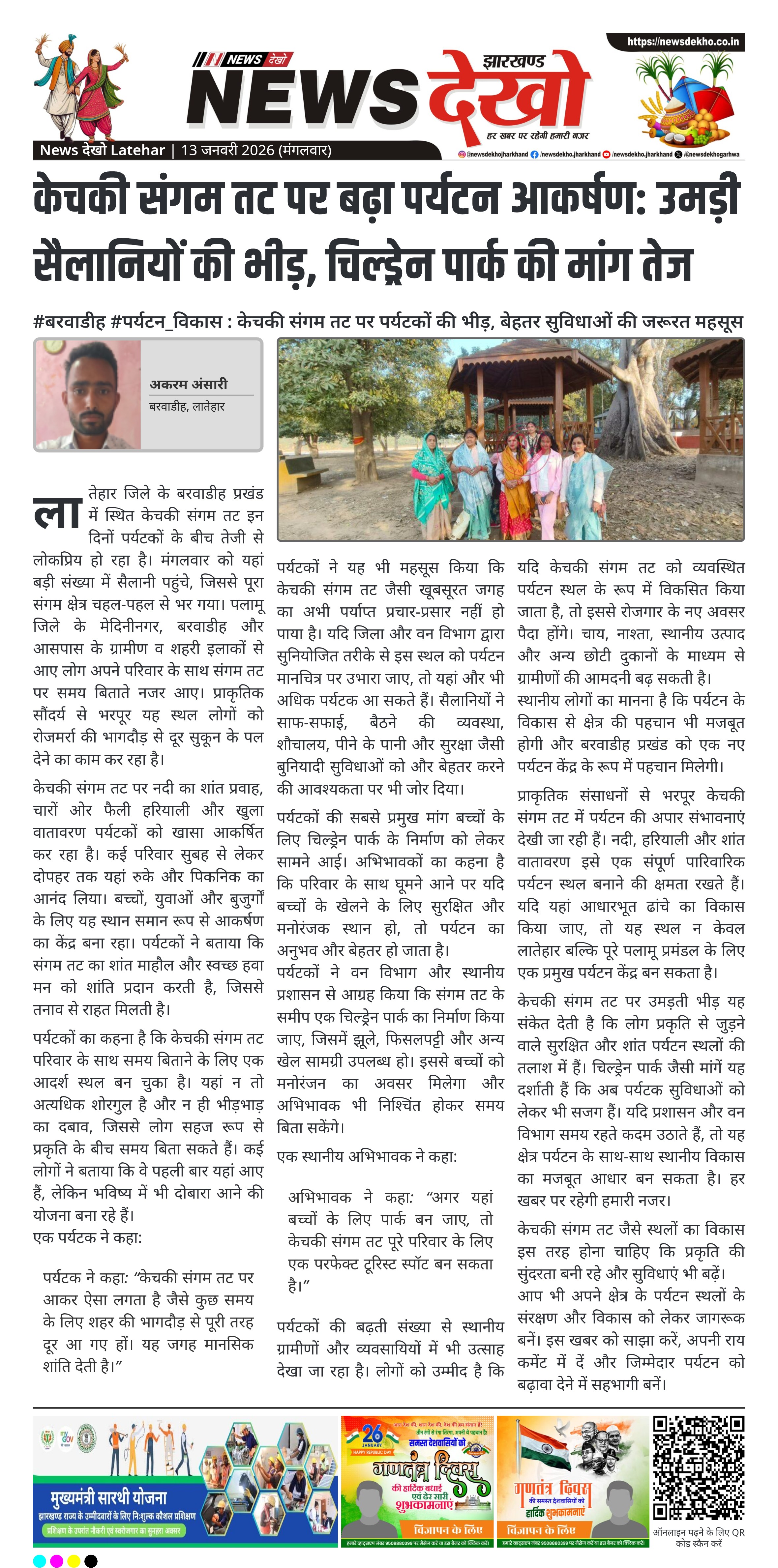 लातेहार जिले के बरवाडीह प्रखंड स्थित केचकी संगम तट पर मंगलवार को बड़ी संख्या में पर्यटक पहुंचे। पलामू और आसपास के इलाकों से आए लोगों ने परिवार संग प्राकृतिक सौंदर्य के बीच समय बिताया। बढ़ती भीड़ के बीच पर्यटकों ने बच्चों के लिए चिल्ड्रेन पार्क निर्माण की मांग उठाई। इससे क्षेत्र में पारिवारिक पर्यटन और स्थानीय अर्थव्यवस्था को बढ़ावा मिलने की उम्मीद जताई जा रही है।