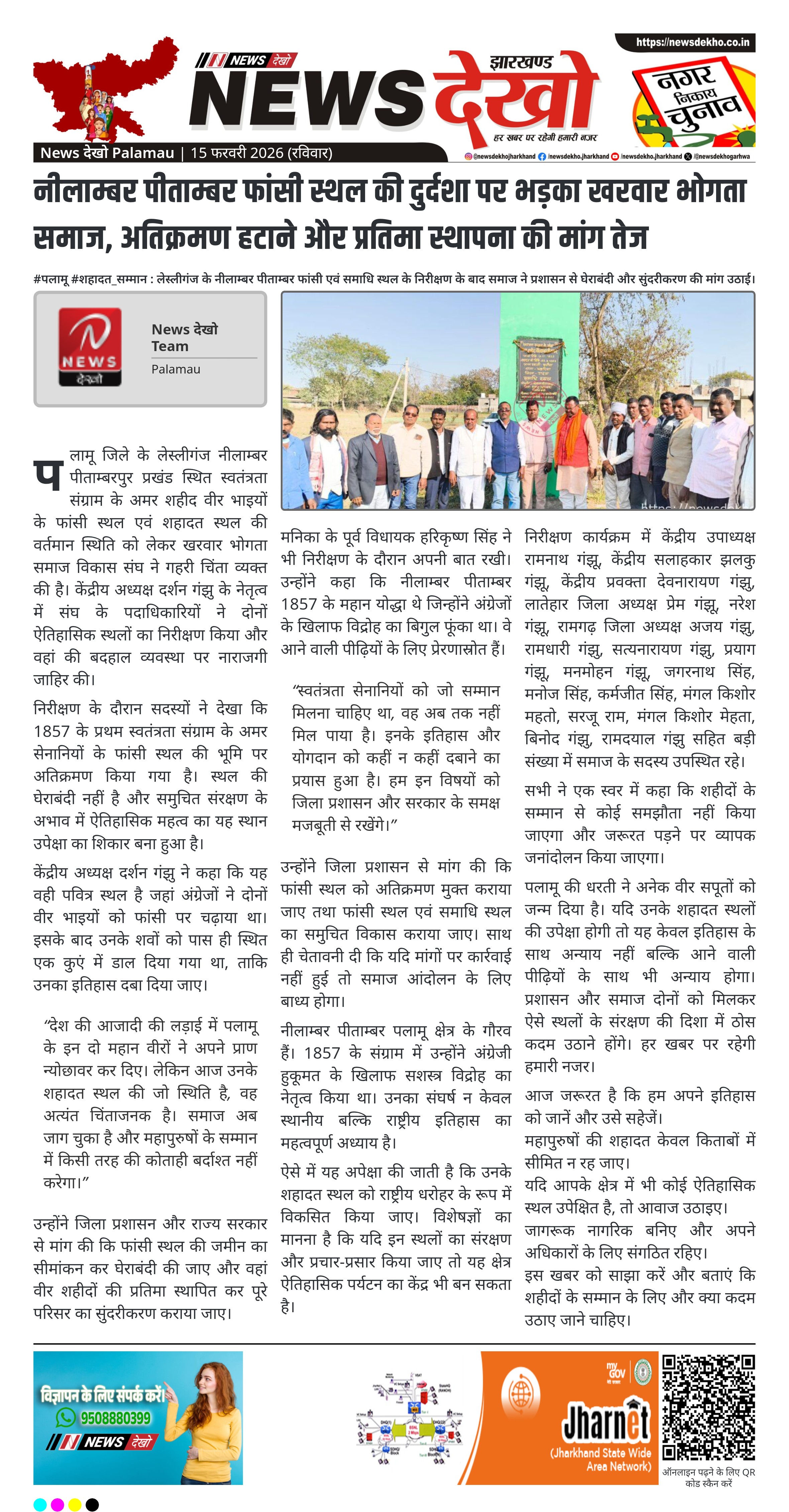 पलामू जिले के लेस्लीगंज नीलाम्बर पीताम्बरपुर प्रखंड स्थित स्वतंत्रता संग्राम के अमर शहीद वीर भाइयों के फांसी स्थल एवं शहादत स्थल की वर्तमान स्थिति को लेकर खरवार भोगता समाज विकास संघ ने गहरी चिंता व्यक्त की है। केंद्रीय अध्यक्ष दर्शन गंझु के नेतृत्व में संघ के पदाधिकारियों ने दोनों ऐतिहासिक स्थलों का निरीक्षण किया और वहां की बदहाल व्यवस्था पर नाराजगी जाहिर की।