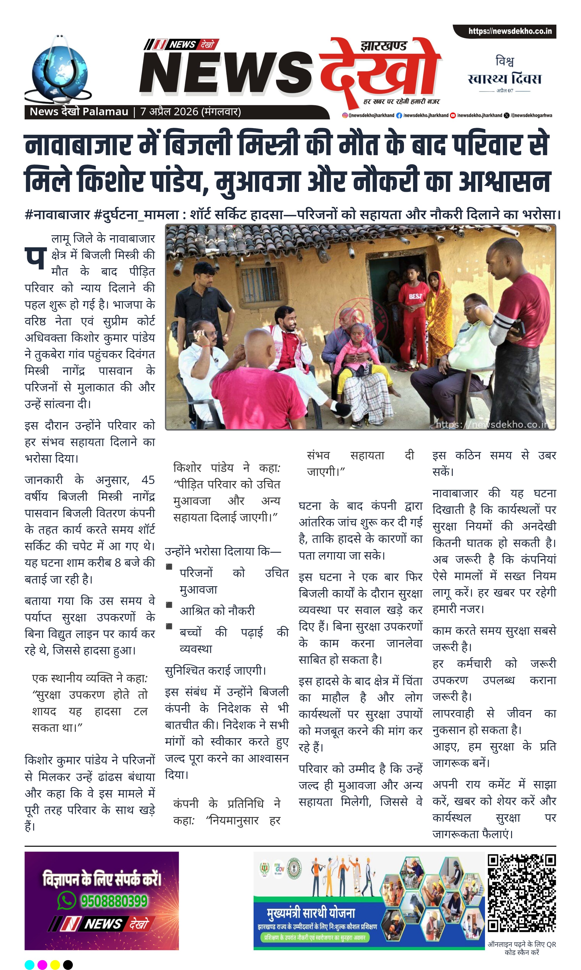 पलामू के नावाबाजार में बिजली मिस्त्री की मौत के बाद भाजपा नेता किशोर कुमार पांडेय ने परिजनों से मुलाकात की। उन्होंने मुआवजा, नौकरी और बच्चों की पढ़ाई की व्यवस्था का आश्वासन दिया। घटना शॉर्ट सर्किट के दौरान काम करते समय हुई थी। कंपनी ने भी सहायता देने की बात कही है।