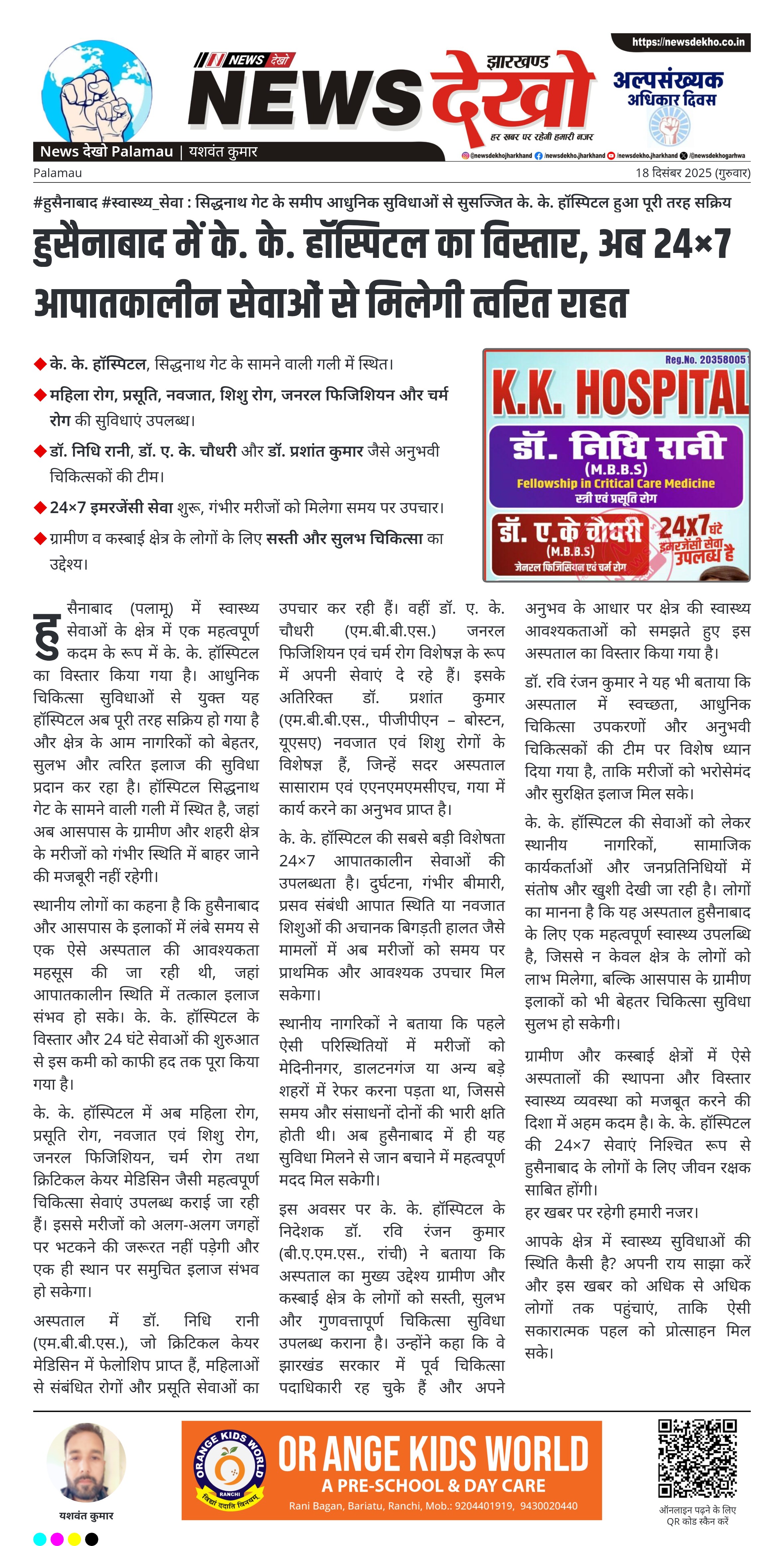 हुसैनाबाद (पलामू) में स्वास्थ्य सेवाओं के क्षेत्र में एक महत्वपूर्ण कदम के रूप में के. के. हॉस्पिटल का विस्तार किया गया है। आधुनिक चिकित्सा सुविधाओं से युक्त यह हॉस्पिटल अब पूरी तरह सक्रिय हो गया है और क्षेत्र के आम नागरिकों को बेहतर, सुलभ और त्वरित इलाज की सुविधा प्रदान कर रहा है। हॉस्पिटल सिद्धनाथ गेट के सामने वाली गली में स्थित है, जहां अब आसपास के ग्रामीण और शहरी क्षेत्र के मरीजों को गंभीर स्थिति में बाहर जाने की मजबूरी नहीं रहेगी।