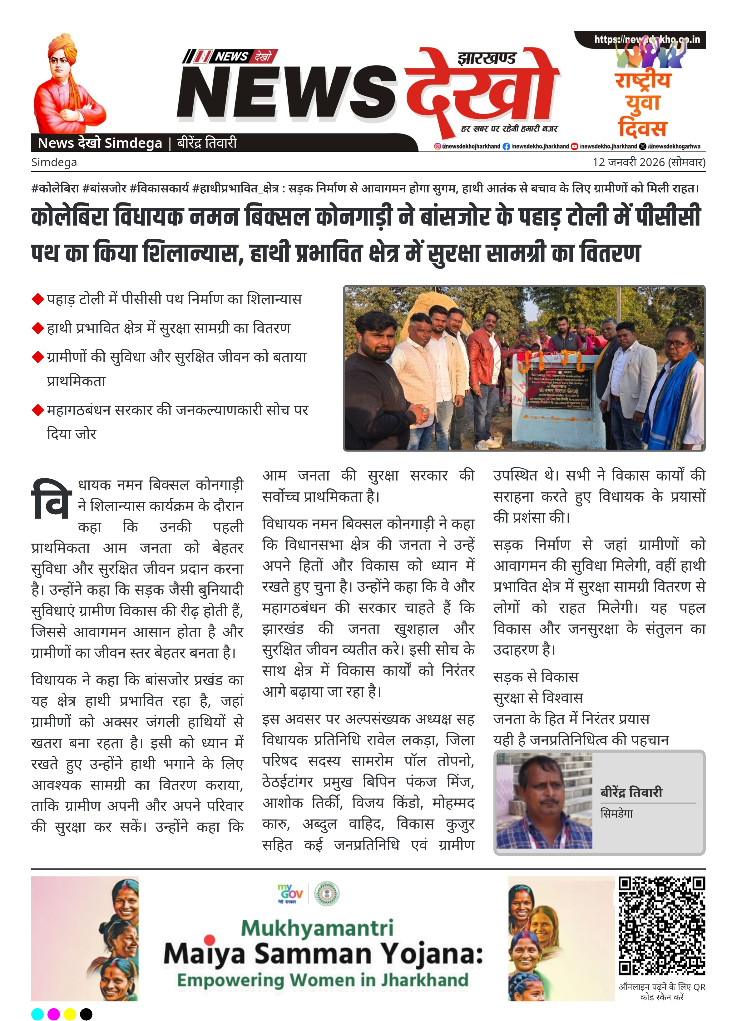 कोलेबिरा विधानसभा क्षेत्र से विधायक नमन बिक्सल कोनगाड़ी ने सोमवार 12 जनवरी 2026 को बांसजोर प्रखंड अंतर्गत पहाड़ टोली में पीसीसी पथ निर्माण कार्य का विधिवत शिलान्यास किया। इसके साथ ही हाथी प्रभावित क्षेत्र के ग्रामीणों के बीच हाथी भगाने के लिए उपयोगी सामग्री जैसे टॉर्च, मशाल और मोबिल का वितरण भी किया गया। यह पहल ग्रामीणों की सुरक्षा और सुविधा को ध्यान में रखते हुए की गई।