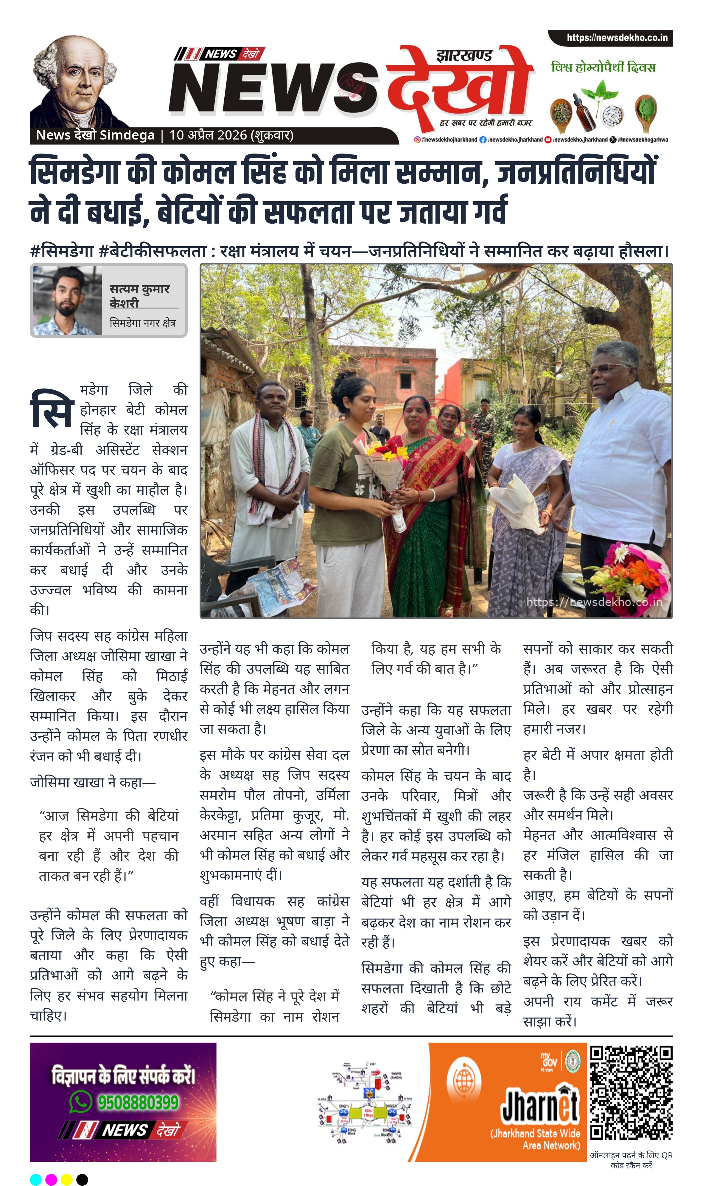 “आज सिमडेगा की बेटियां हर क्षेत्र में अपनी पहचान बना रही हैं और देश की ताकत बन रही हैं।”