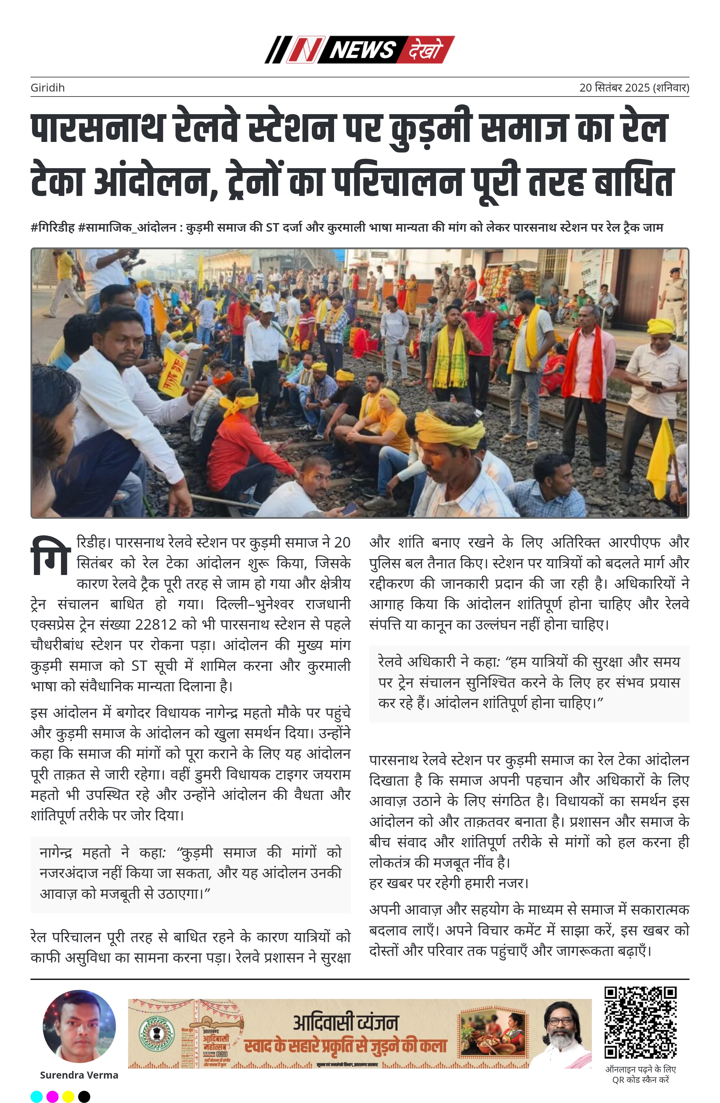 पारसनाथ रेलवे स्टेशन पर कुड़मी समाज का रेल टेका आंदोलन दिखाता है कि समाज अपनी पहचान और अधिकारों के लिए आवाज़ उठाने के लिए संगठित है। विधायकों का समर्थन इस आंदोलन को और ताक़तवर बनाता है। प्रशासन और समाज के बीच संवाद और शांतिपूर्ण तरीके से मांगों को हल करना ही लोकतंत्र की मजबूत नींव है।