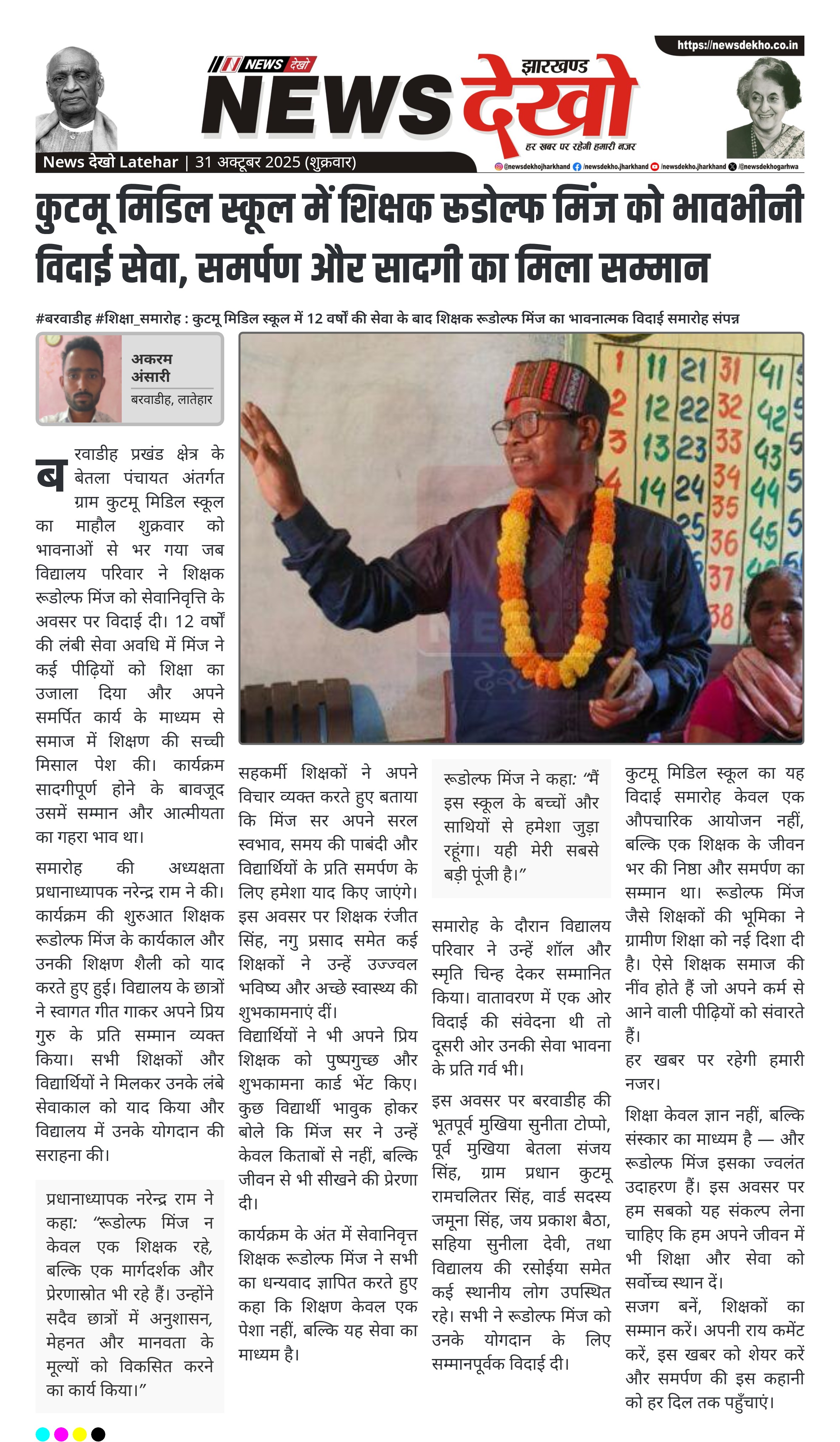 कुटमू मिडिल स्कूल का यह विदाई समारोह केवल एक औपचारिक आयोजन नहीं, बल्कि एक शिक्षक के जीवन भर की निष्ठा और समर्पण का सम्मान था। रूडोल्फ मिंज जैसे शिक्षकों की भूमिका ने ग्रामीण शिक्षा को नई दिशा दी है। ऐसे शिक्षक समाज की नींव होते हैं जो अपने कर्म से आने वाली पीढ़ियों को संवारते हैं।