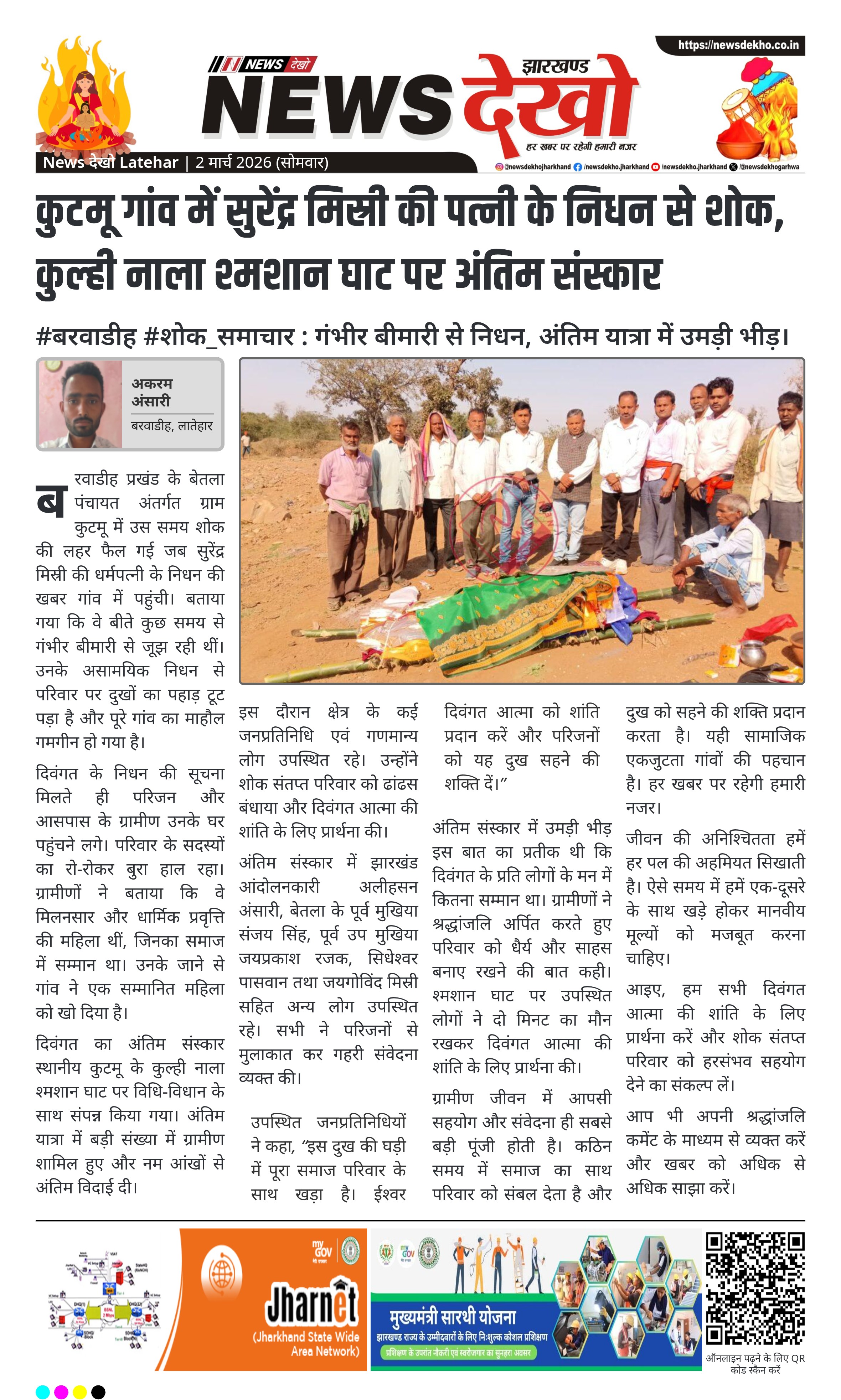 बरवाडीह प्रखंड के बेतला पंचायत अंतर्गत ग्राम कुटमू में उस समय शोक की लहर फैल गई जब सुरेंद्र मिस्री की धर्मपत्नी के निधन की खबर गांव में पहुंची। बताया गया कि वे बीते कुछ समय से गंभीर बीमारी से जूझ रही थीं। उनके असामयिक निधन से परिवार पर दुखों का पहाड़ टूट पड़ा है और पूरे गांव का माहौल गमगीन हो गया है।