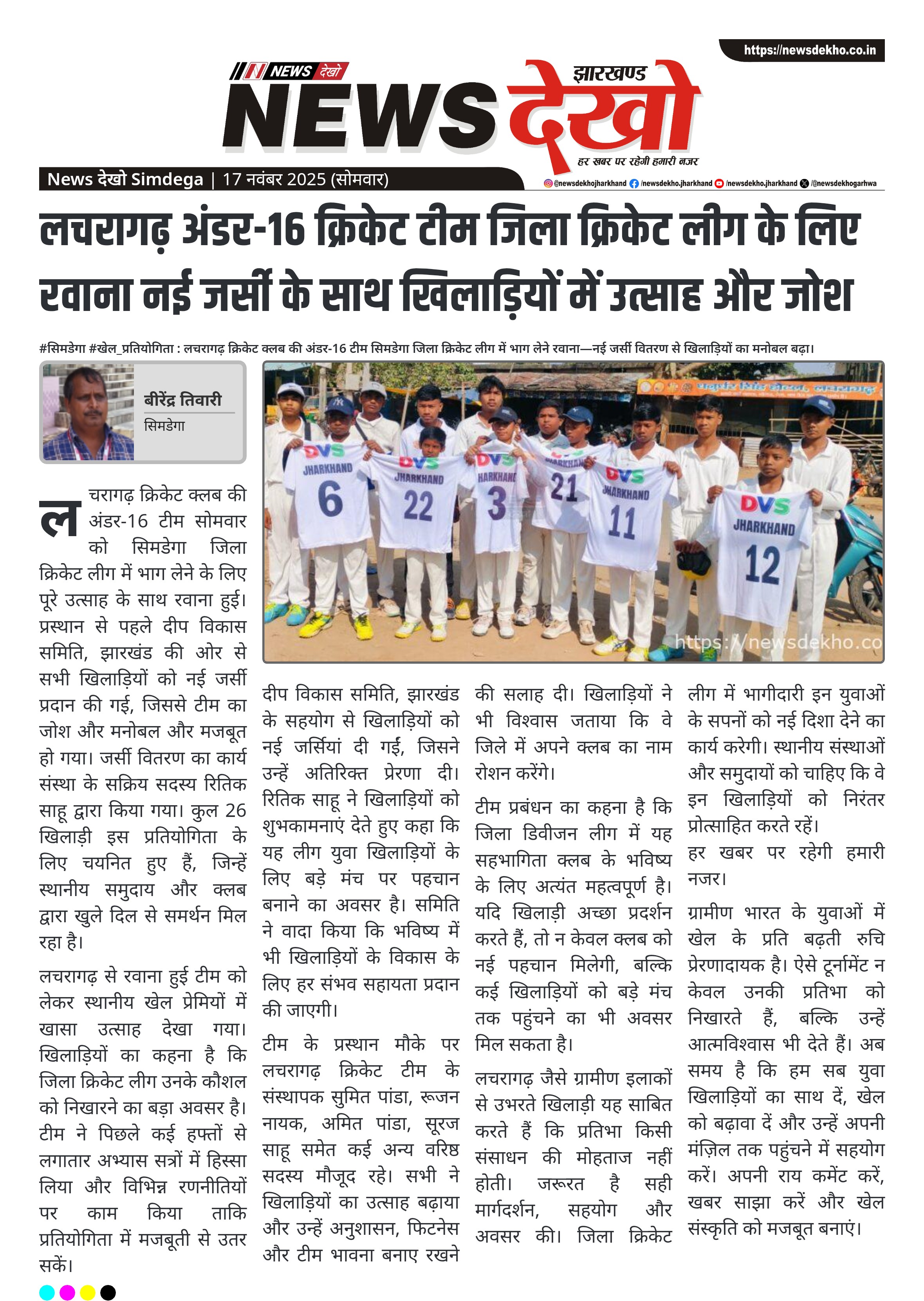 #सिमडेगा #खेल_प्रतियोगिता : लचरागढ़ क्रिकेट क्लब की अंडर-16 टीम सिमडेगा जिला क्रिकेट लीग में भाग लेने रवाना—नई जर्सी वितरण से खिलाड़ियों का मनोबल बढ़ा।