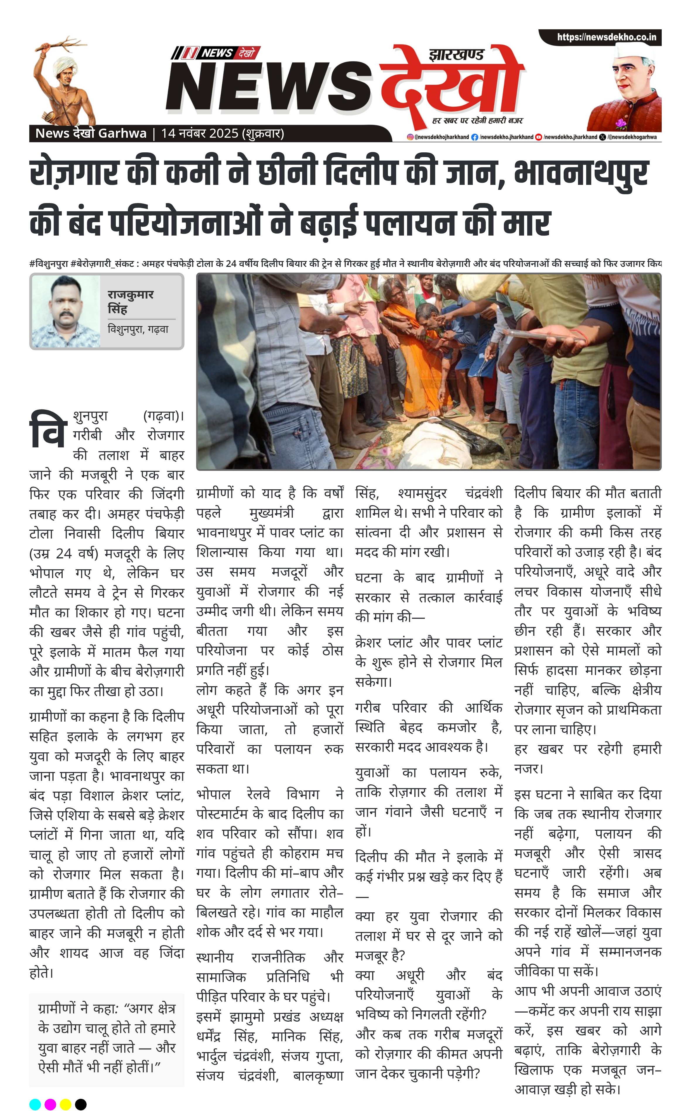विशुनपुरा (गढ़वा)। गरीबी और रोजगार की तलाश में बाहर जाने की मजबूरी ने एक बार फिर एक परिवार की जिंदगी तबाह कर दी। अमहर पंचफेड़ी टोला निवासी दिलीप बियार (उम्र 24 वर्ष) मजदूरी के लिए भोपाल गए थे, लेकिन घर लौटते समय वे ट्रेन से गिरकर मौत का शिकार हो गए। घटना की खबर जैसे ही गांव पहुंची, पूरे इलाके में मातम फैल गया और ग्रामीणों के बीच बेरोज़गारी का मुद्दा फिर तीखा हो उठा।