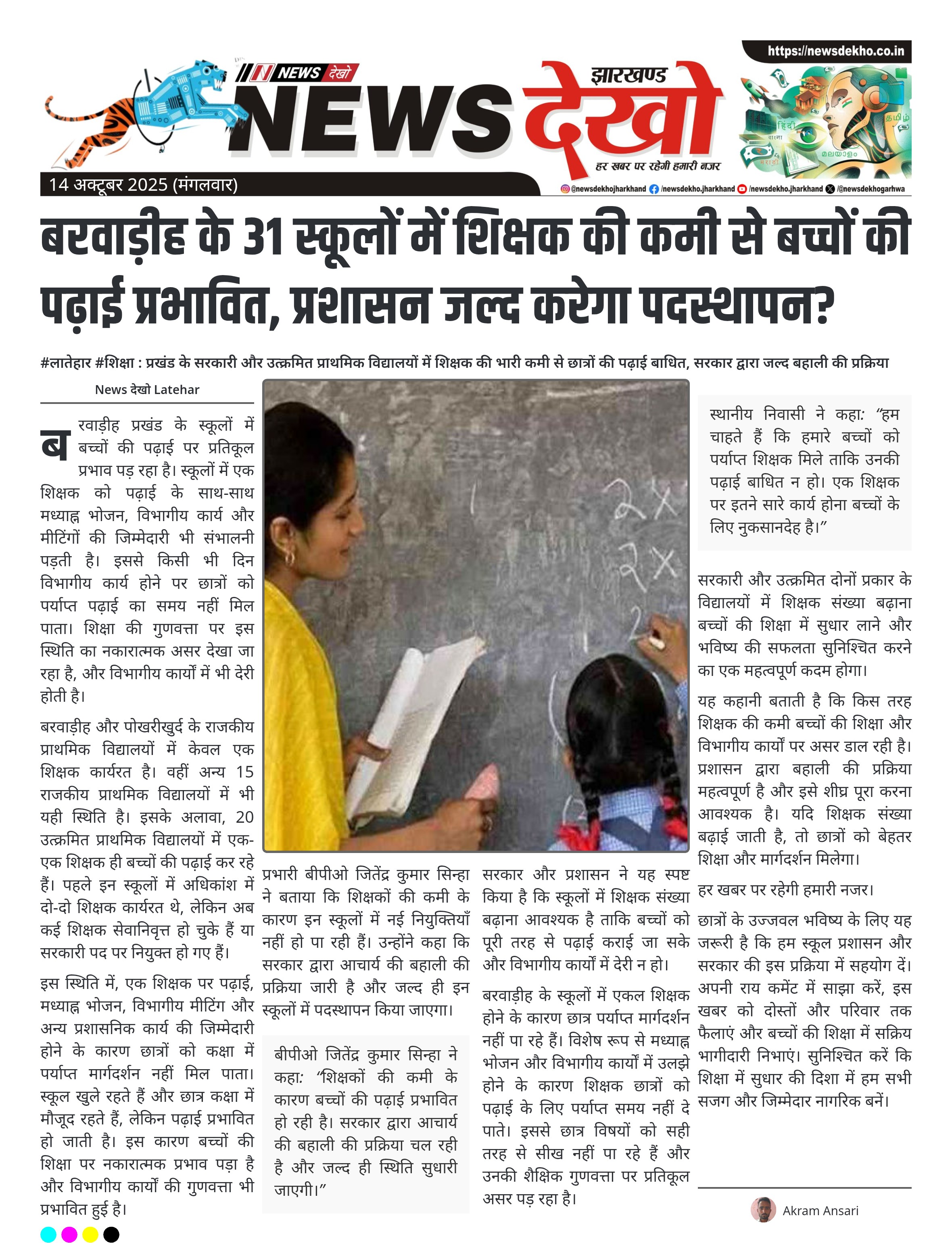- बरवाड़ीह प्रखंड के 31 स्कूलों में केवल एक-एक शिक्षक कार्यरत, पढ़ाई और विभागीय कार्य प्रभावित।