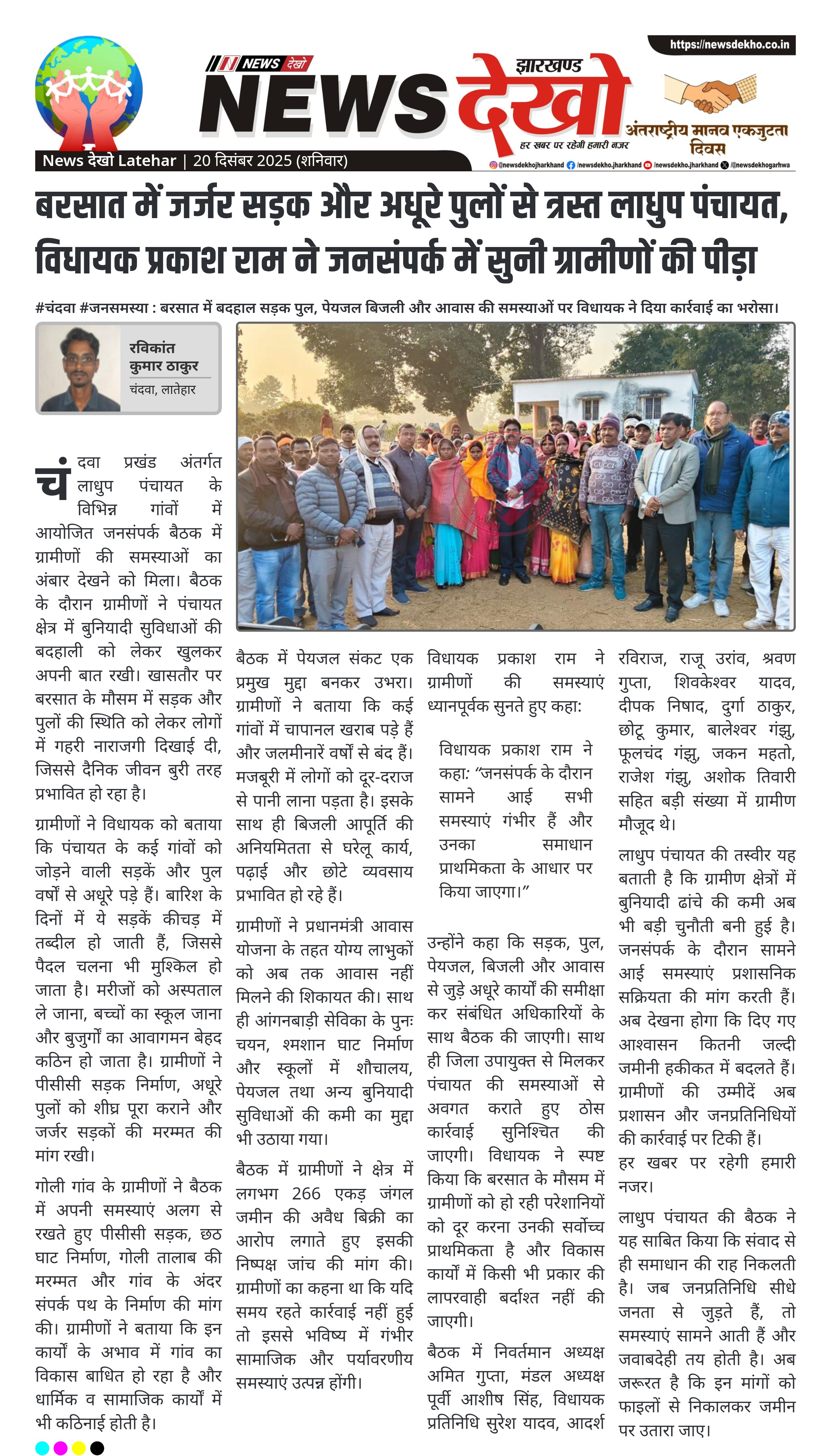 चंदवा प्रखंड के लाधुप पंचायत में जनसंपर्क अभियान के दौरान विधायक प्रकाश राम ने ग्रामीणों के साथ बैठक कर उनकी समस्याएं सुनीं। बैठक में बरसात के मौसम में जर्जर सड़कों, अधूरे पुलों और पेयजल संकट को लेकर ग्रामीणों ने गंभीर चिंता जताई। इसके साथ ही बिजली आपूर्ति, आवास योजना, आंगनबाड़ी, श्मशान घाट और स्कूलों की बुनियादी सुविधाओं के मुद्दे भी सामने आए। विधायक ने सभी समस्याओं को प्राथमिकता के आधार पर समाधान का आश्वासन दिया।