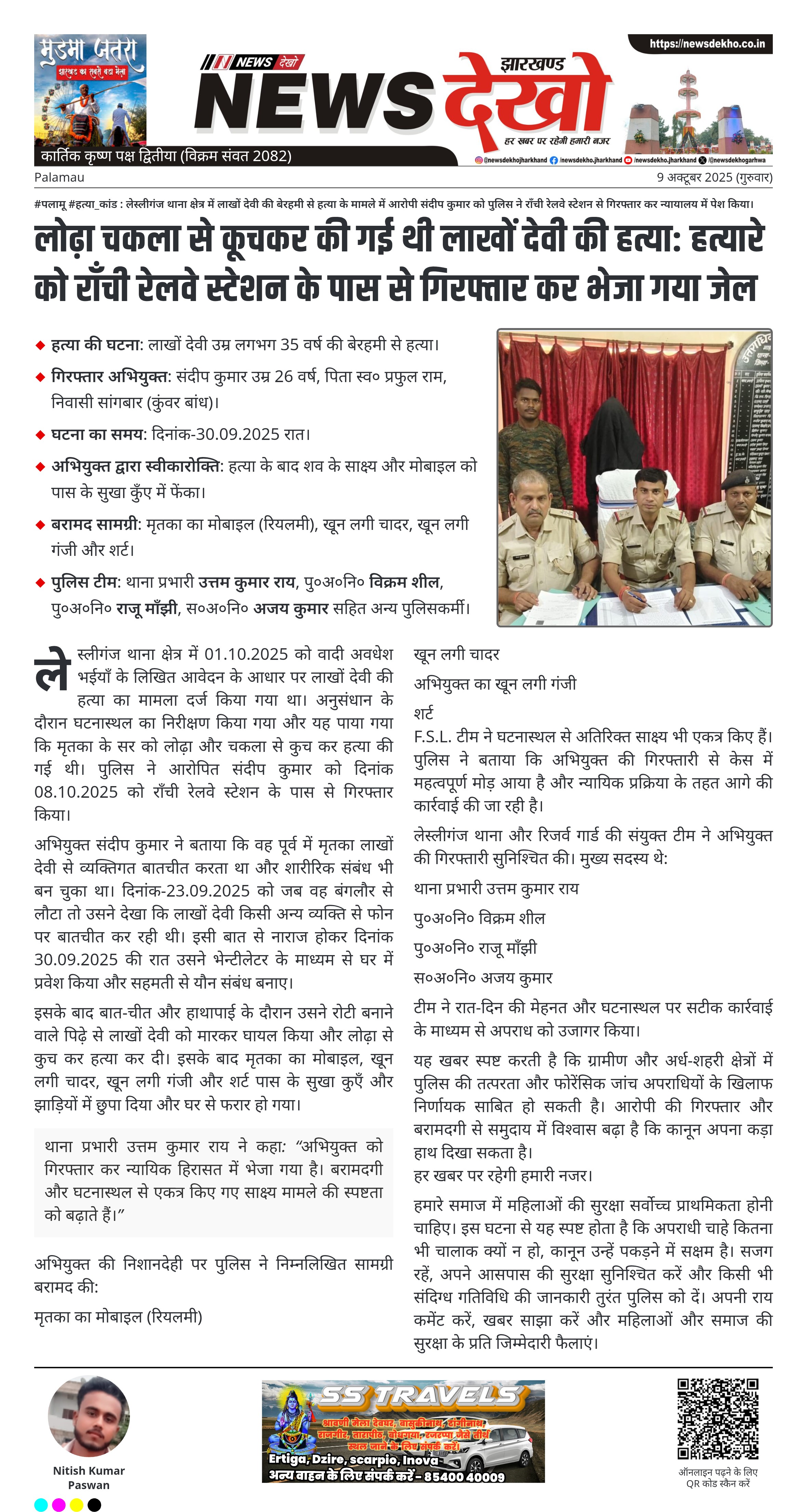 लेस्लीगंज थाना क्षेत्र में 01.10.2025 को वादी अवधेश भईयाँ के लिखित आवेदन के आधार पर लाखों देवी की हत्या का मामला दर्ज किया गया था। अनुसंधान के दौरान घटनास्थल का निरीक्षण किया गया और यह पाया गया कि मृतका के सर को लोढ़ा और चकला से कुच कर हत्या की गई थी। पुलिस ने आरोपित संदीप कुमार को दिनांक 08.10.2025 को राँची रेलवे स्टेशन के पास से गिरफ्तार किया।