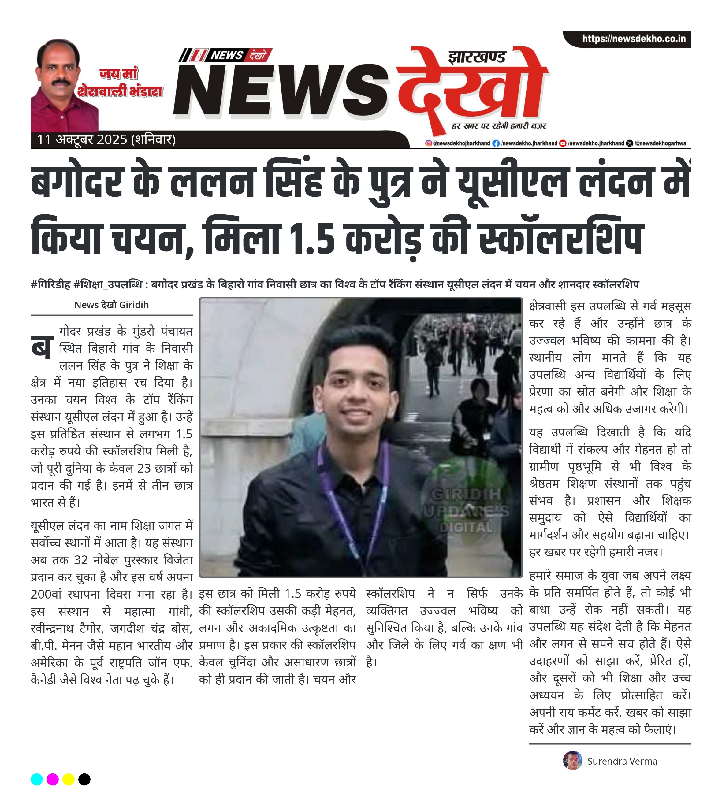 बगोदर प्रखंड के मुंडरो पंचायत स्थित बिहारो गांव के निवासी ललन सिंह के पुत्र ने शिक्षा के क्षेत्र में नया इतिहास रच दिया है। उनका चयन विश्व के टॉप रैंकिंग संस्थान यूसीएल लंदन में हुआ है। उन्हें इस प्रतिष्ठित संस्थान से लगभग 1.5 करोड़ रुपये की स्कॉलरशिप मिली है, जो पूरी दुनिया के केवल 23 छात्रों को प्रदान की गई है। इनमें से तीन छात्र भारत से हैं।