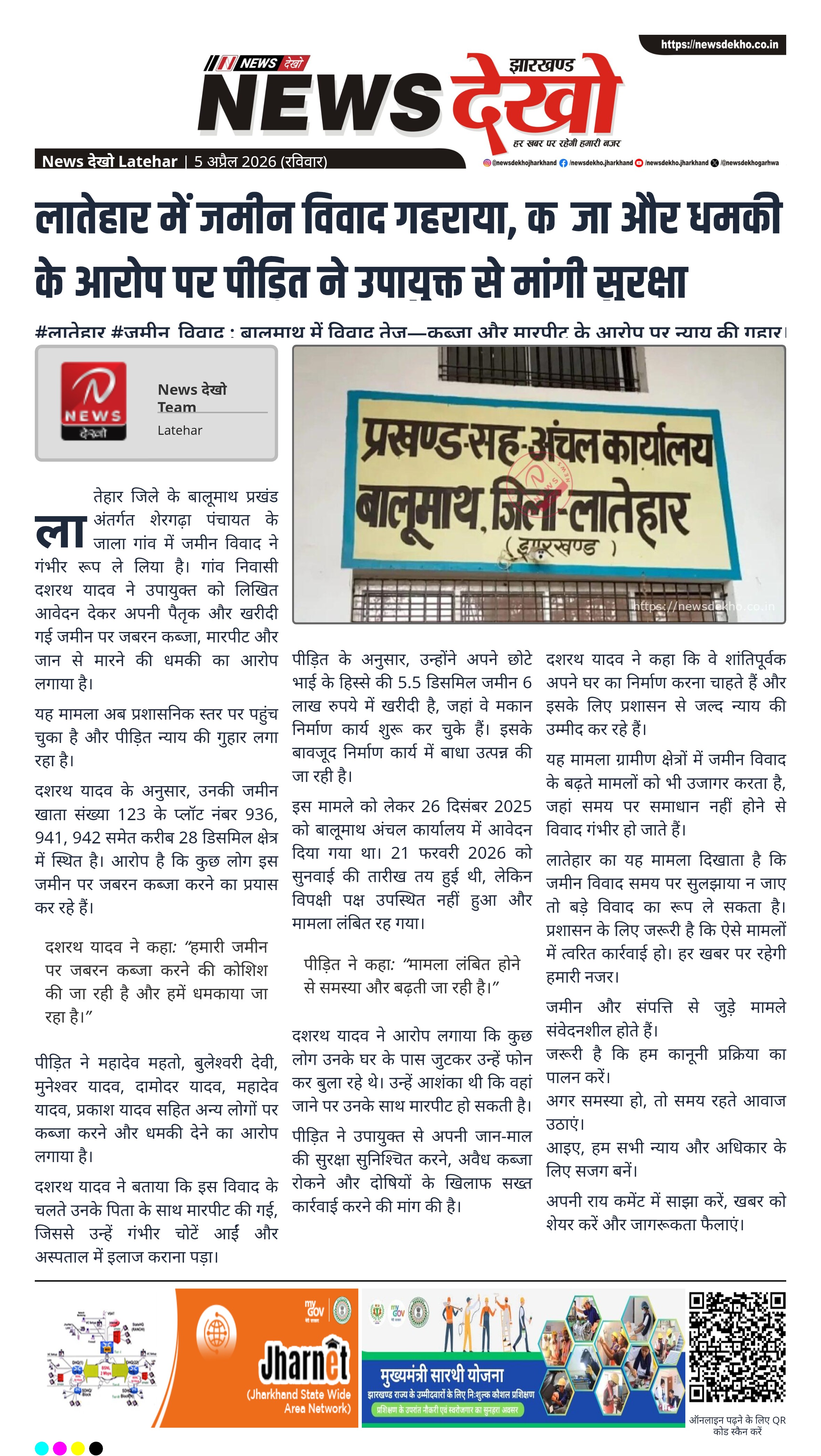 लातेहार जिले के बालूमाथ प्रखंड अंतर्गत शेरगढ़ा पंचायत के जाला गांव में जमीन विवाद ने गंभीर रूप ले लिया है। गांव निवासी दशरथ यादव ने उपायुक्त को लिखित आवेदन देकर अपनी पैतृक और खरीदी गई जमीन पर जबरन कब्जा, मारपीट और जान से मारने की धमकी का आरोप लगाया है।