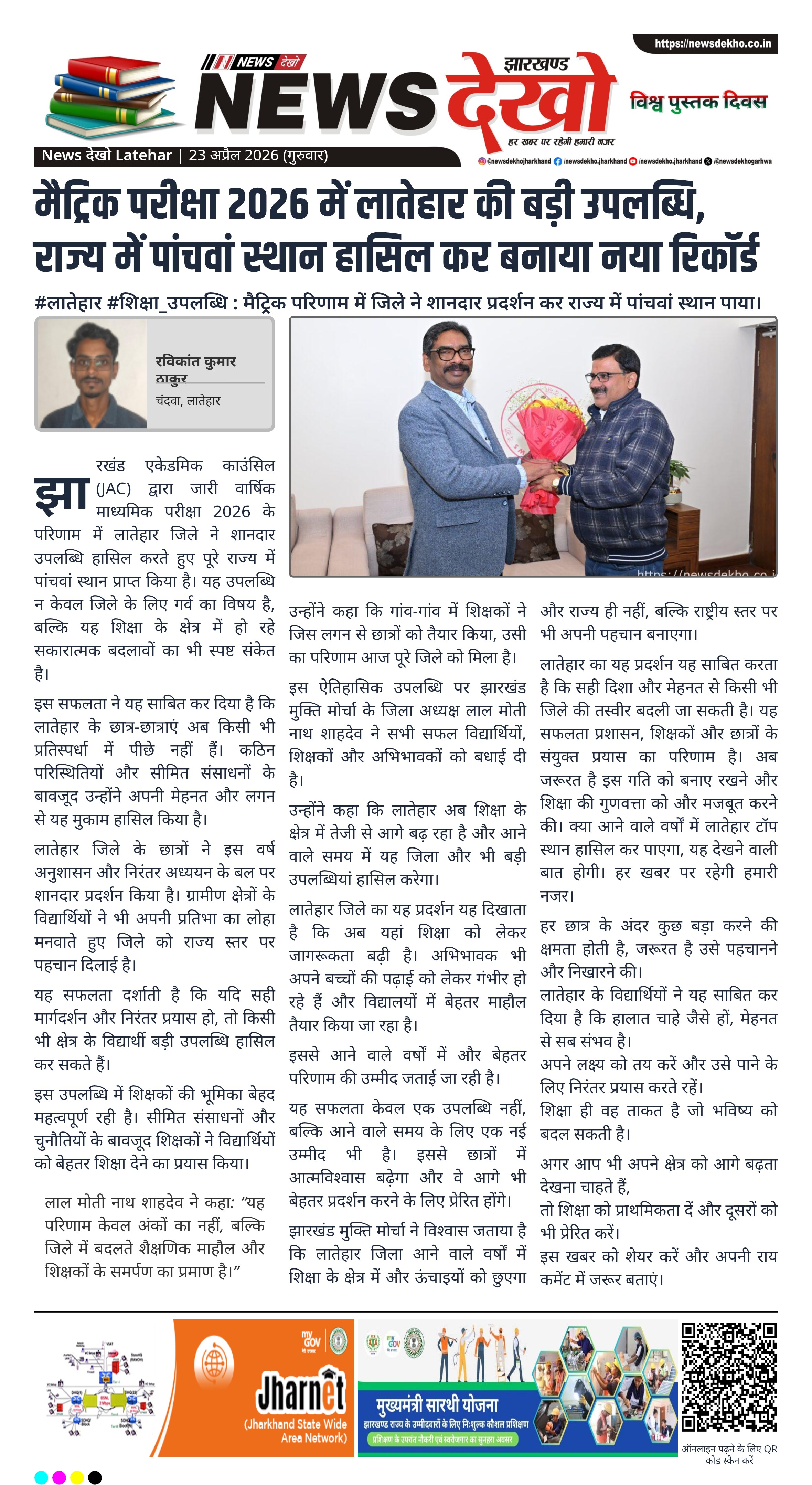 #लातेहार #शिक्षा_उपलब्धि : मैट्रिक परिणाम में जिले ने शानदार प्रदर्शन कर राज्य में पांचवां स्थान पाया।