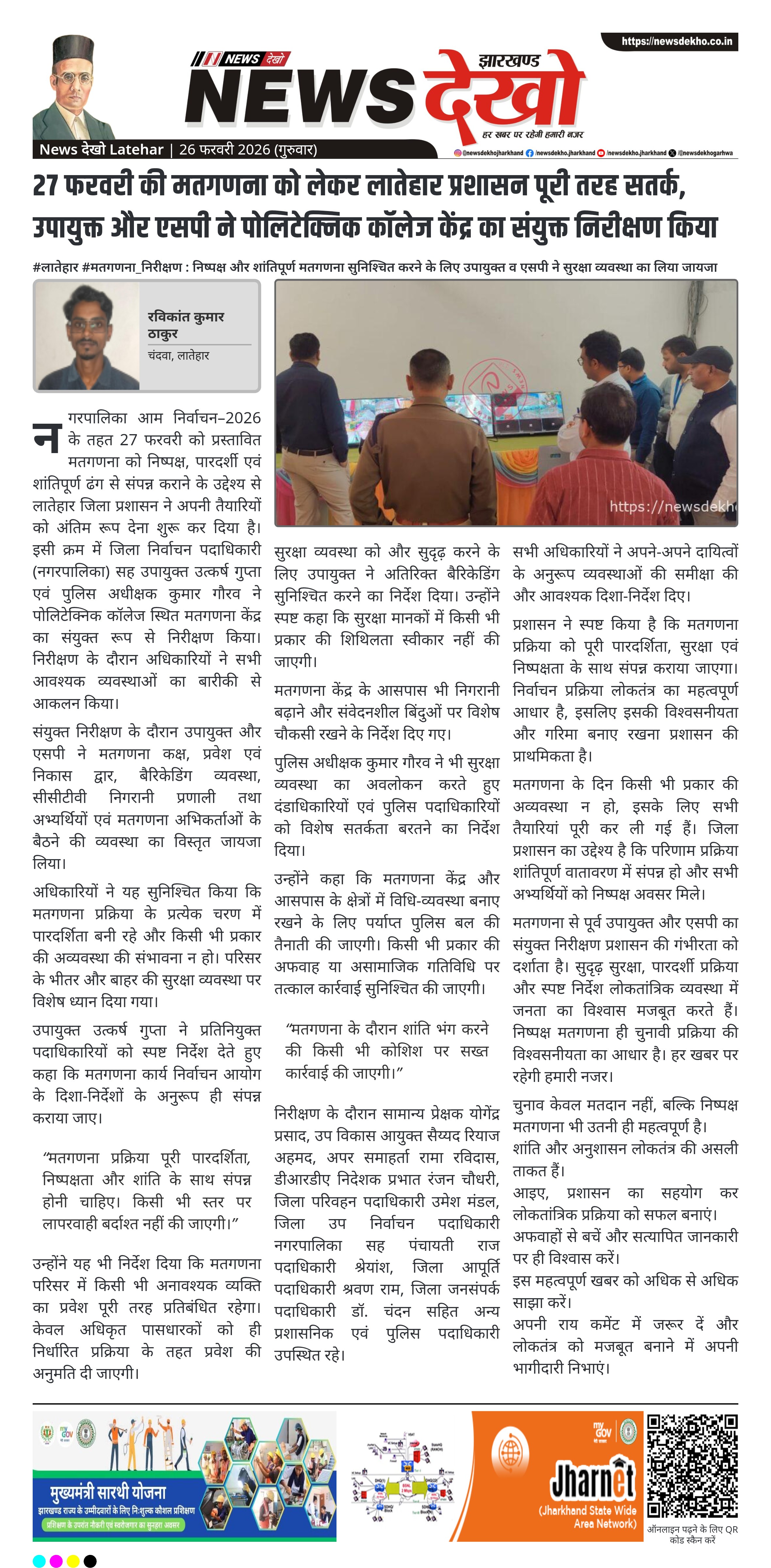 नगरपालिका आम निर्वाचन–2026 के तहत 27 फरवरी को होने वाली मतगणना को लेकर लातेहार जिला प्रशासन पूरी तरह सतर्क है। जिला निर्वाचन पदाधिकारी सह उपायुक्त उत्कर्ष गुप्ता और पुलिस अधीक्षक कुमार गौरव ने पोलिटेक्निक कॉलेज स्थित मतगणना केंद्र का संयुक्त निरीक्षण कर सुरक्षा व व्यवस्थाओं का विस्तृत आकलन किया।