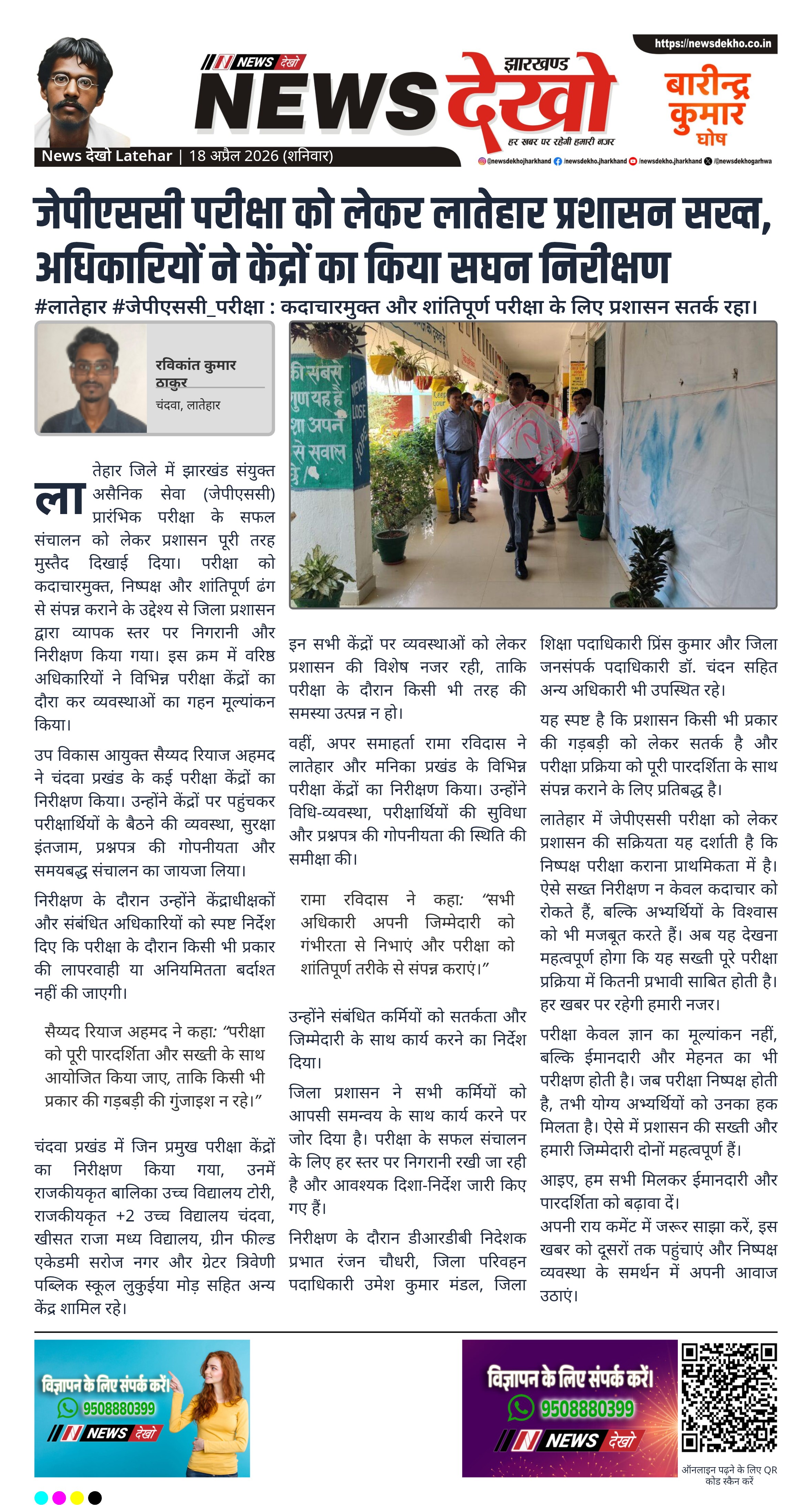 लातेहार जिले में झारखंड संयुक्त असैनिक सेवा (जेपीएससी) प्रारंभिक परीक्षा के सफल संचालन को लेकर प्रशासन पूरी तरह मुस्तैद दिखाई दिया। परीक्षा को कदाचारमुक्त, निष्पक्ष और शांतिपूर्ण ढंग से संपन्न कराने के उद्देश्य से जिला प्रशासन द्वारा व्यापक स्तर पर निगरानी और निरीक्षण किया गया। इस क्रम में वरिष्ठ अधिकारियों ने विभिन्न परीक्षा केंद्रों का दौरा कर व्यवस्थाओं का गहन मूल्यांकन किया।