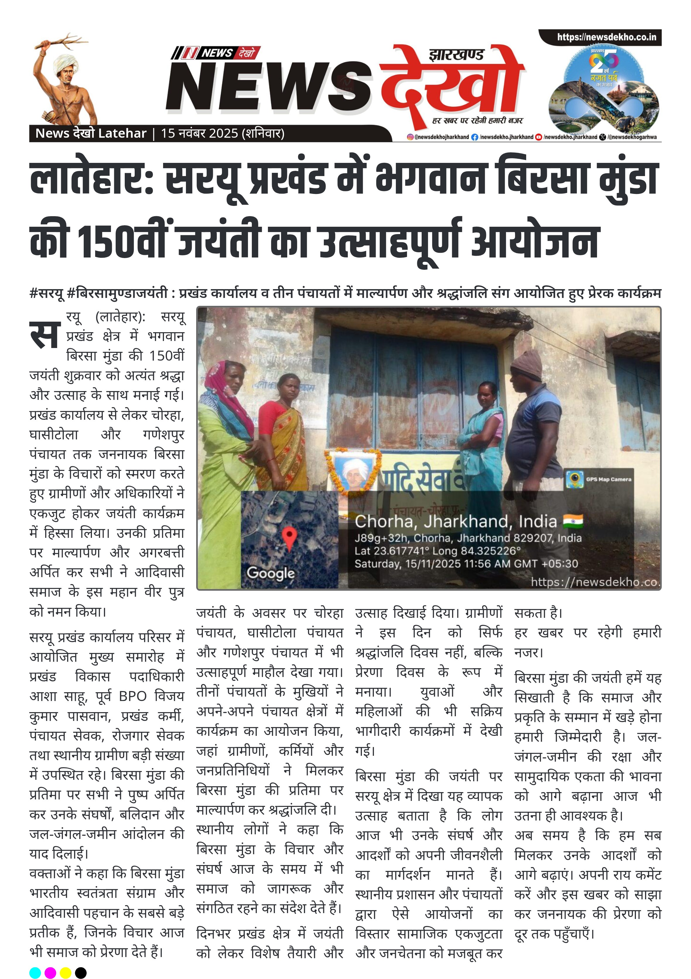 लातेहार: सरयू प्रखंड में भगवान बिरसा मुंडा की 150वीं जयंती का उत्साहपूर्ण आयोजन