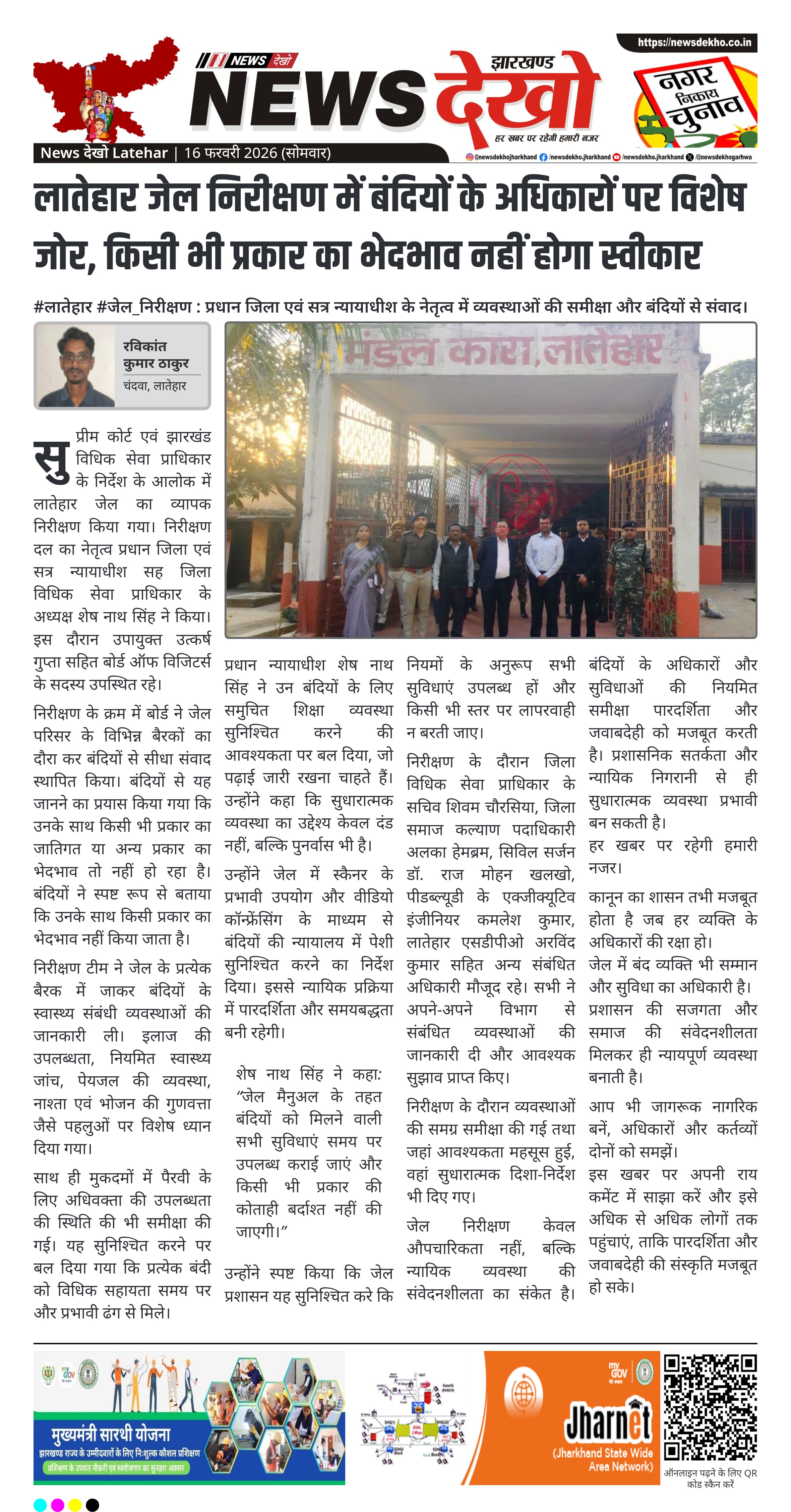 सुप्रीम कोर्ट और झारखंड विधिक सेवा प्राधिकार के निर्देश पर लातेहार जेल का निरीक्षण किया गया। प्रधान जिला एवं सत्र न्यायाधीश शेष नाथ सिंह, उपायुक्त उत्कर्ष गुप्ता और बोर्ड ऑफ विजिटर्स ने बंदियों से सीधे संवाद कर सुविधाओं और अधिकारों की स्थिति जानी। निरीक्षण में भेदभाव न होने की पुष्टि हुई और सुधारात्मक निर्देश दिए गए।