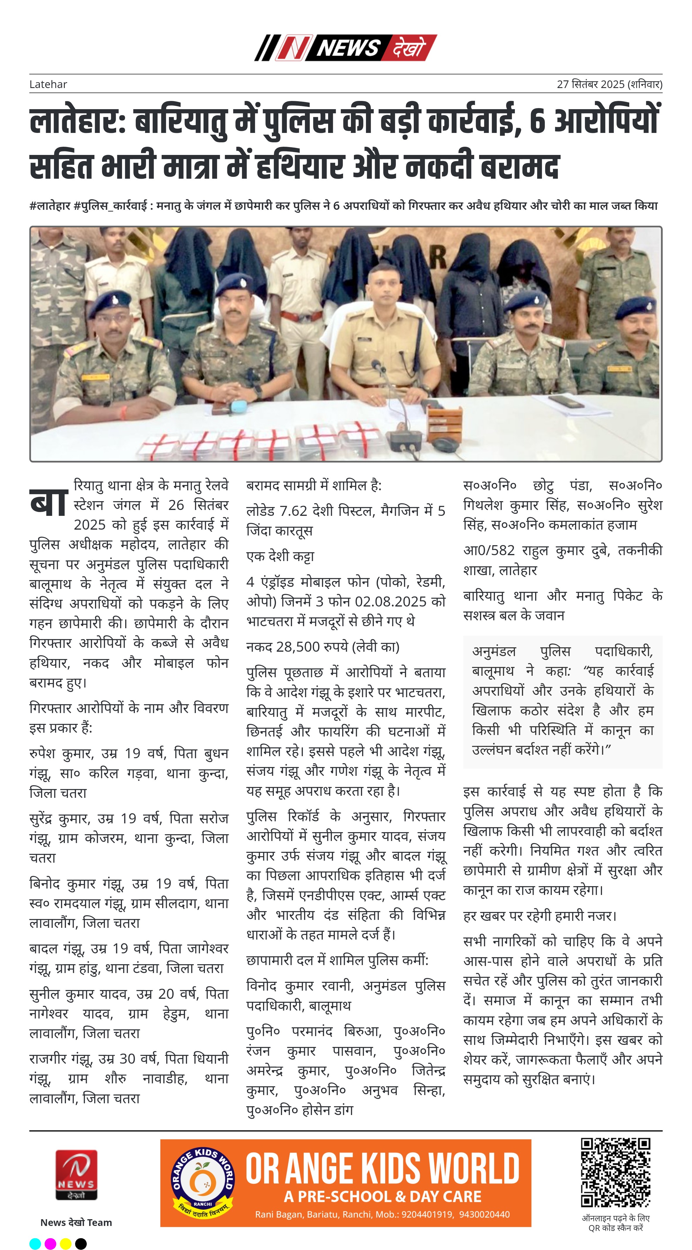 बारियातु थाना क्षेत्र के मनातु रेलवे स्टेशन जंगल में 26 सितंबर 2025 को हुई इस कार्रवाई में पुलिस अधीक्षक महोदय, लातेहार की सूचना पर अनुमंडल पुलिस पदाधिकारी बालूमाथ के नेतृत्व में संयुक्त दल ने संदिग्ध अपराधियों को पकड़ने के लिए गहन छापेमारी की। छापेमारी के दौरान गिरफ्तार आरोपियों के कब्जे से अवैध हथियार, नकद और मोबाइल फोन बरामद हुए।