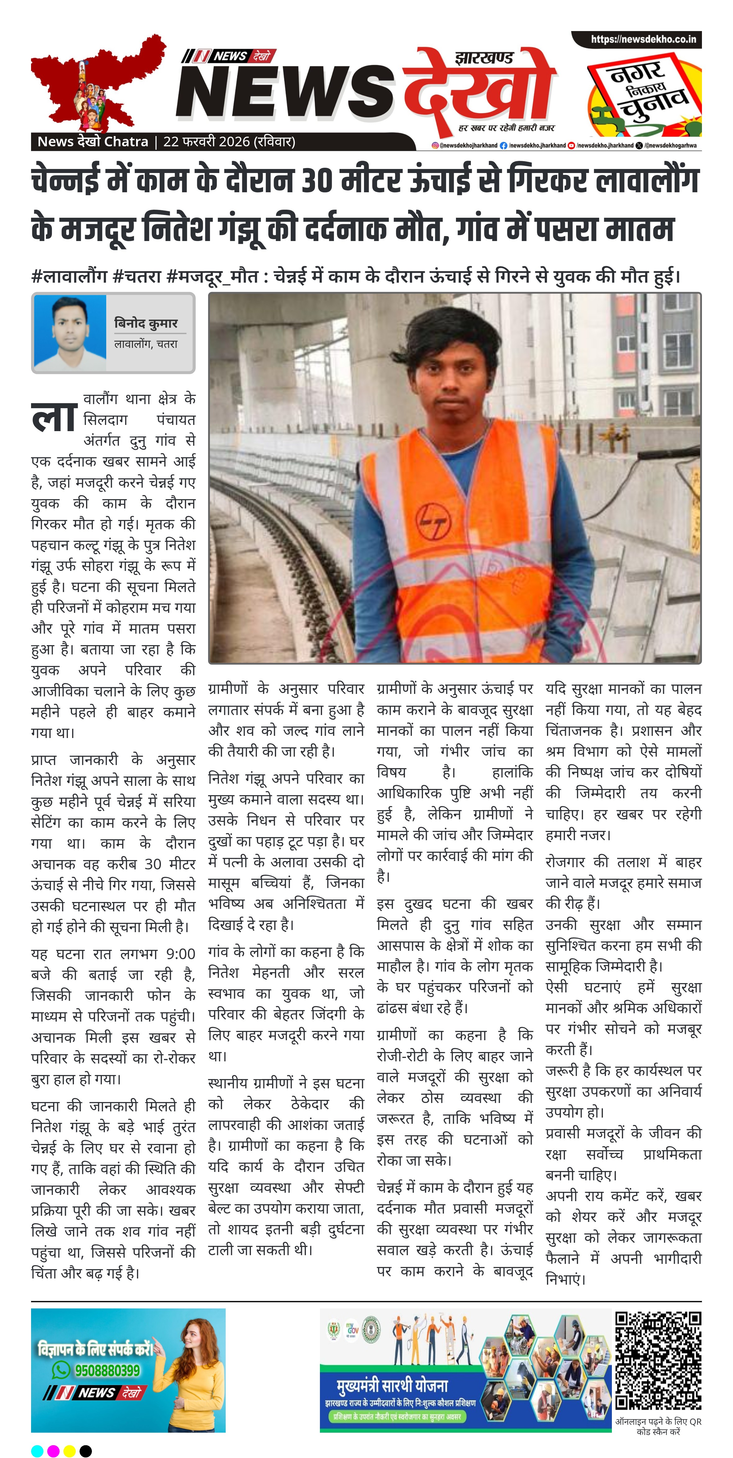 चेन्नई में काम के दौरान हुई यह दर्दनाक मौत प्रवासी मजदूरों की सुरक्षा व्यवस्था पर गंभीर सवाल खड़े करती है। ऊंचाई पर काम कराने के बावजूद यदि सुरक्षा मानकों का पालन नहीं किया गया, तो यह बेहद चिंताजनक है। प्रशासन और श्रम विभाग को ऐसे मामलों की निष्पक्ष जांच कर दोषियों की जिम्मेदारी तय करनी चाहिए। हर खबर पर रहेगी हमारी नजर।